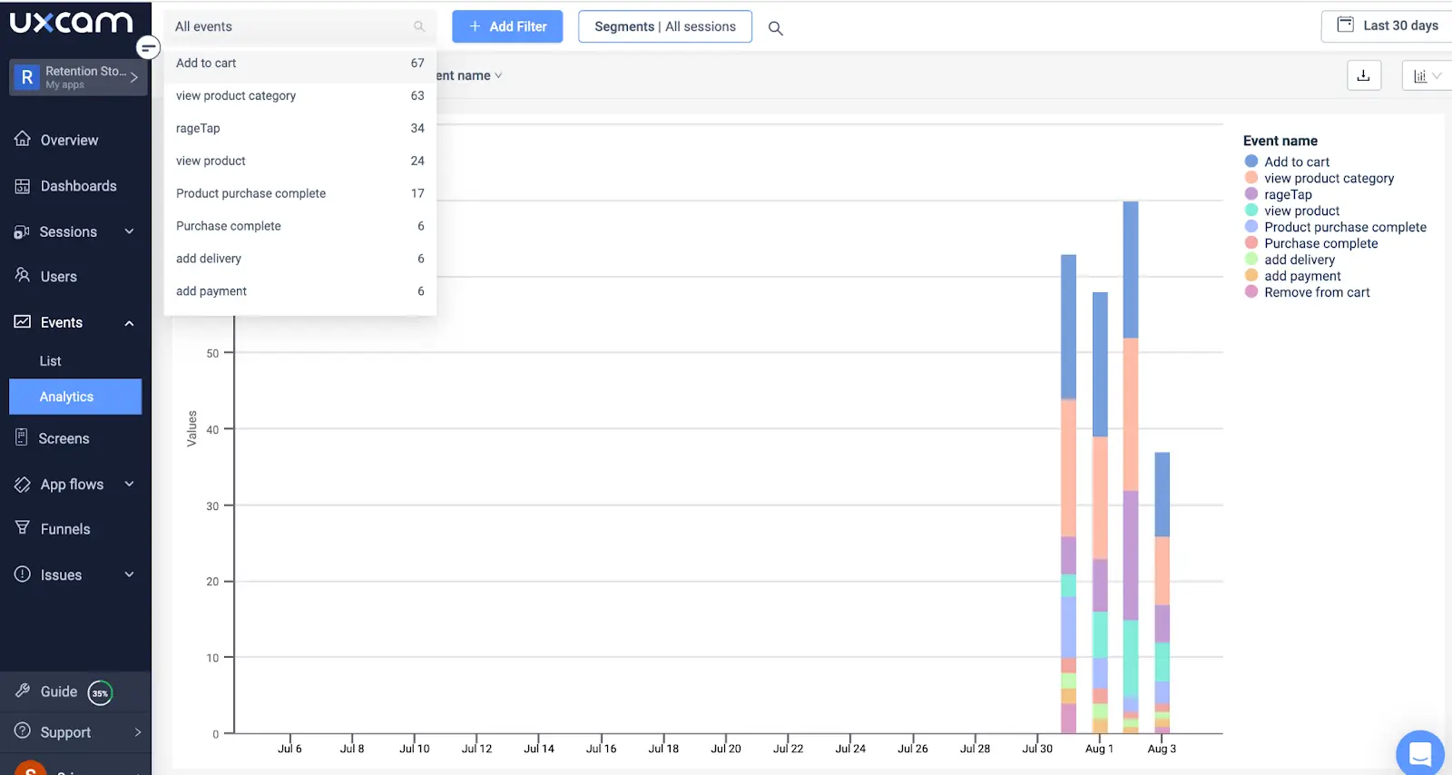 Finding the right tool is essential for a successful benchmarking strategy. For instance, UXCam collects data from every user that visits your app, giving you a detailed overview of things like churn rates, MAUs and DAUs, session length, etc., which you can then benchmark against other, similar apps.