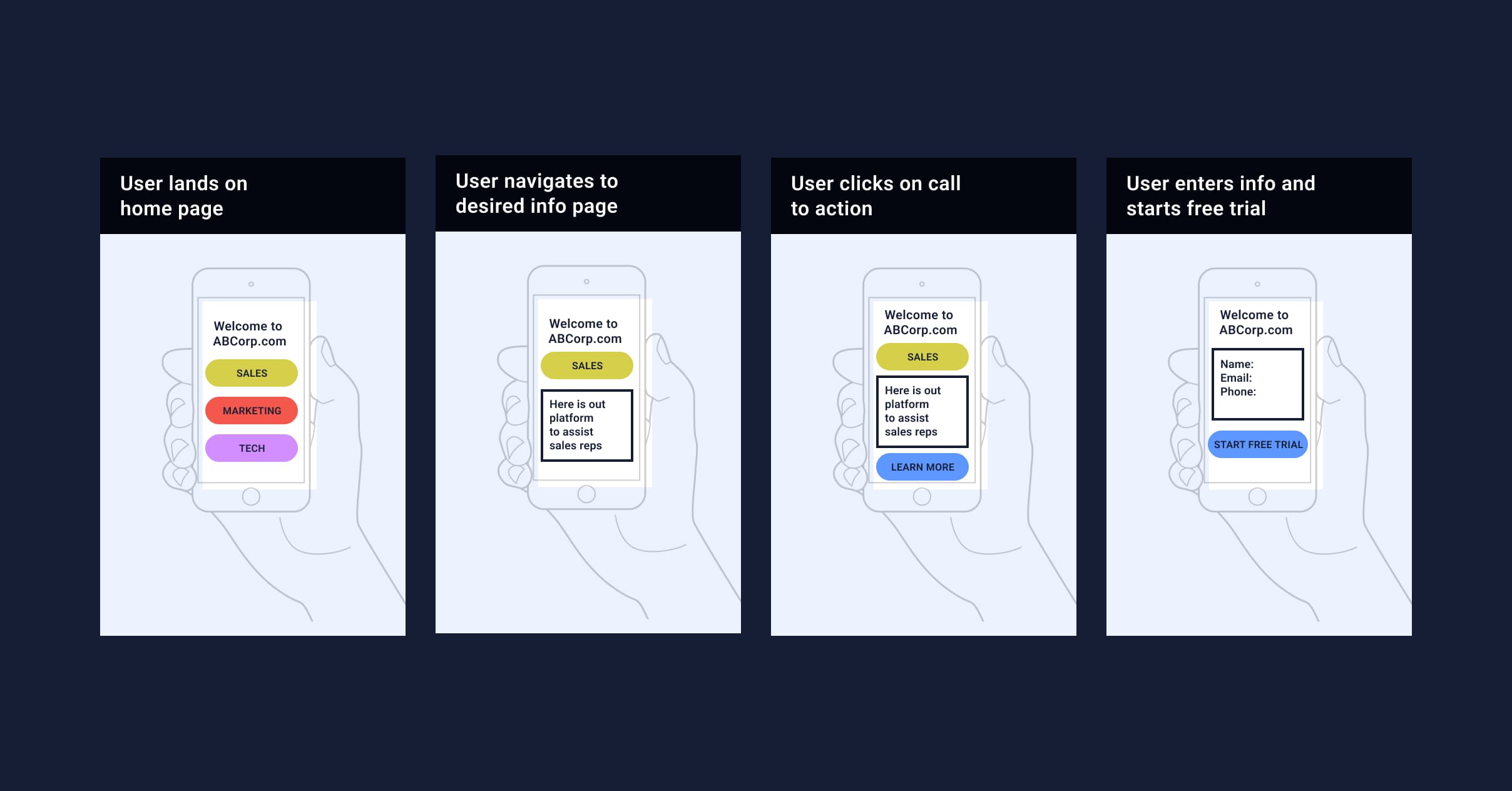 Storyboards are a way to tell a product story using screenshots of mobile devices, they facilitate the creation of user-centered UX design. Screenshots follow one another in chronological order and convey the main events of the story and elements of the user journey.