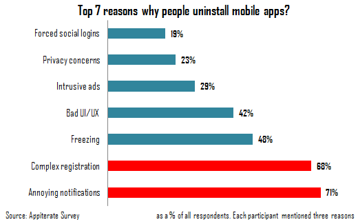 However, push notifications can also be the main driver for uninstalls. 71% of people uninstall apps because of them.