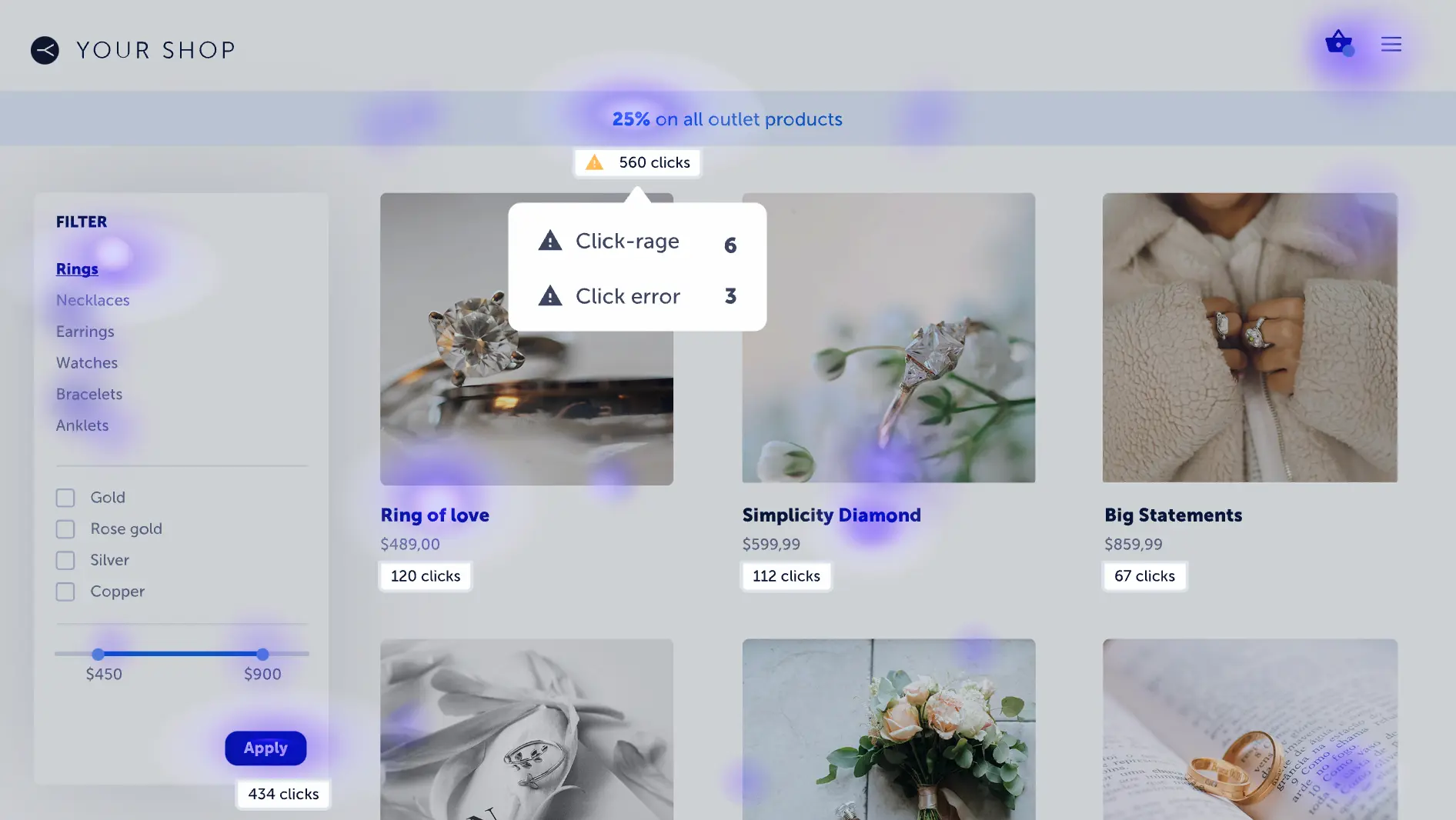 Heatmaps: See generalized representations of where your users (or particular user segments) are clicking on each web page or app screen.