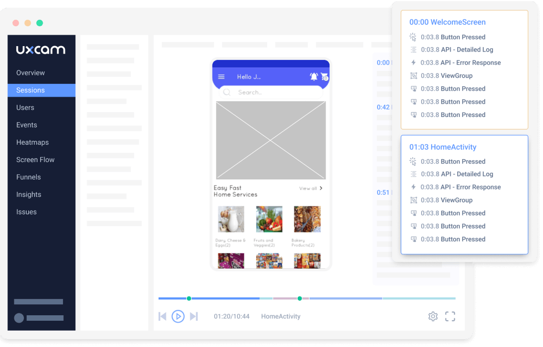 From the moment of installation, UXCam starts tracking how users interact with your app, showing you the screens they visit and the journey they take. It even automatically detects user frustrations like rage taps and unresponsive gestures.