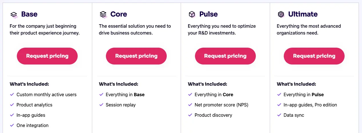 Pendo’s pricing plans start from a free plan for up to 500 monthly active users. The paid plans include Base, Core, Pulse, and Ultimate, with pricing based on monthly active users and offering increasing levels of features and capabilities.