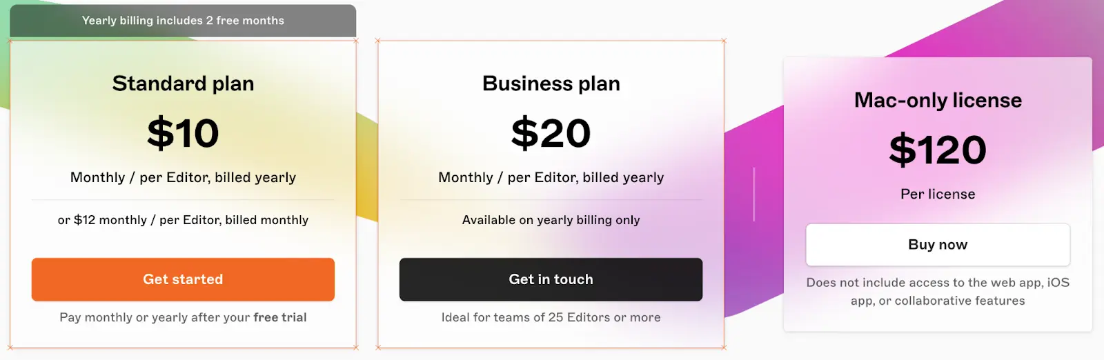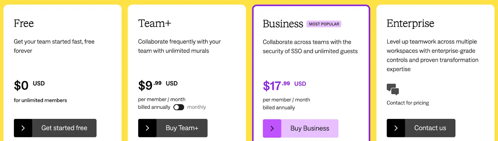 Mural has 4 plans and charges per member on their premium plans. The Freemium plan has a generous selection of features for unlimited members to get your team started.