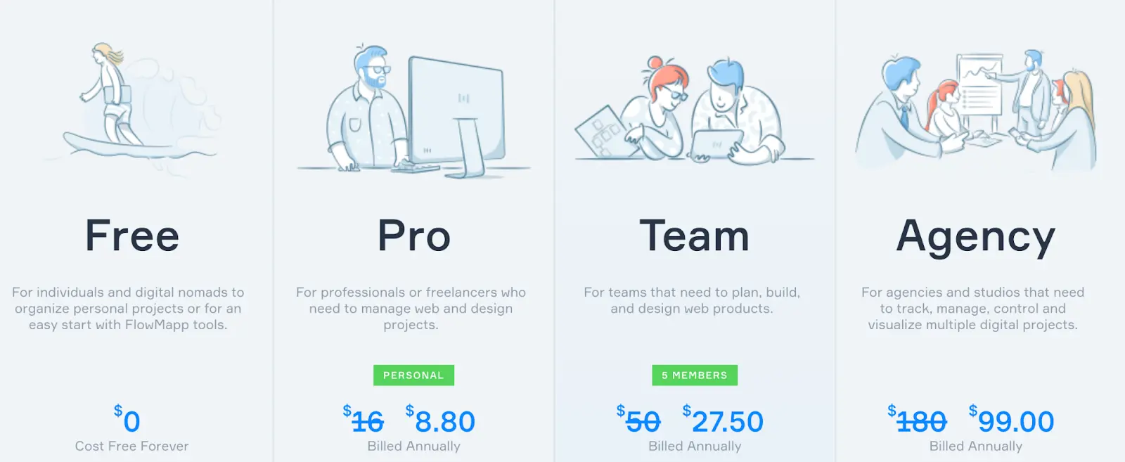FlowMapp offers four pricing tiers: a Free Plan for individuals and digital nomads with 1 project and 100 MB storage; a Pro Plan for professionals at $16/month (or $8.80/month annually) with 5 projects and 10 GB storage; a Team Plan for teams at $50/month (or $27.50/month annually) with unlimited projects and 25 GB storage for up to 5 members; and an Agency Plan for agencies at $180/month (or $99/month annually) with unlimited projects and 50 GB storage. All plans include a free 14-day trial.