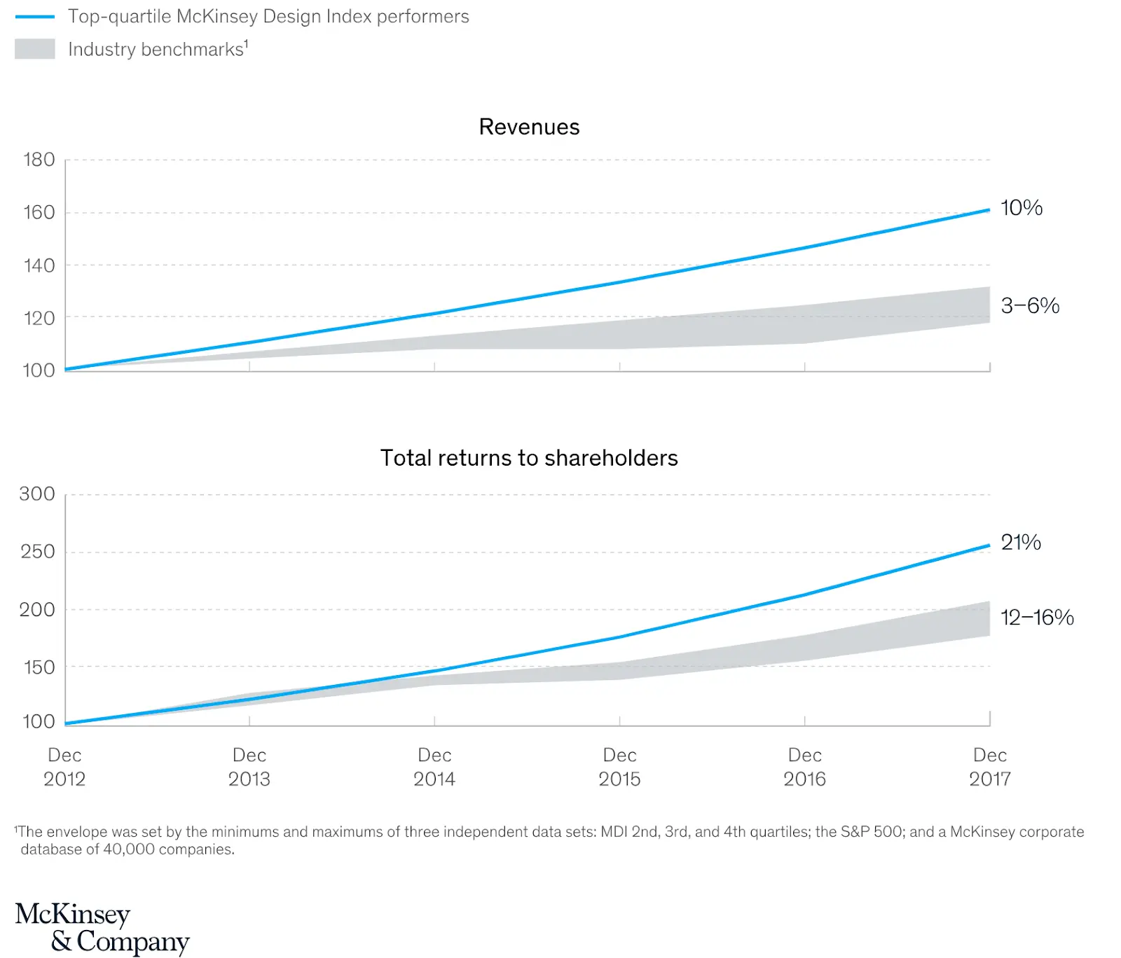 McKinsey & Company's global management consultancy firm investigated the correlation between product design efforts and business results. They analyzed design procedures and financial performance across 300 businesses and found companies that stand out in product design also produce higher returns for shareholders compared to other businesses in their industry.