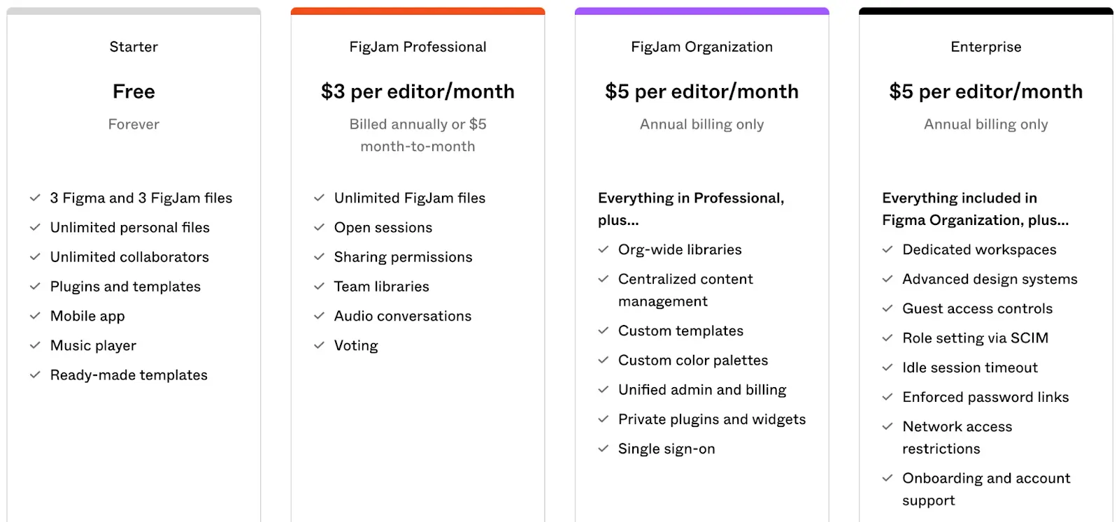 Figma categorizes their pricing under Figma for design and dev and FigJam for whiteboarding. Both include 4 plans, including a Free Forever plan and their Professional plans for students and professionals.