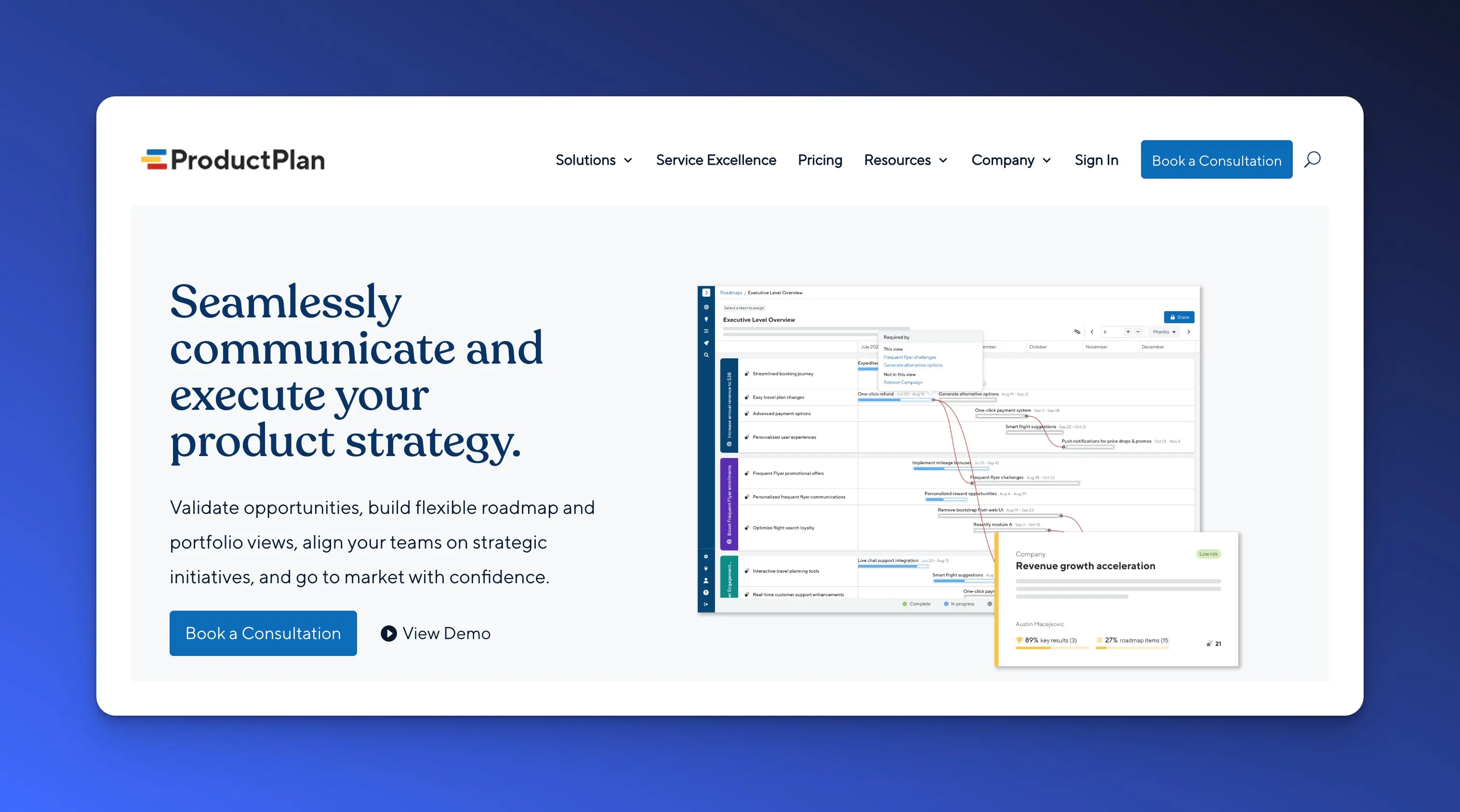 It’s drag-and-drop simple, yet powerful enough for cross-functional collaboration. ProductPlan is great for teams who need to communicate plans clearly—whether that’s a monthly product update or a strategic roadmap for execs.