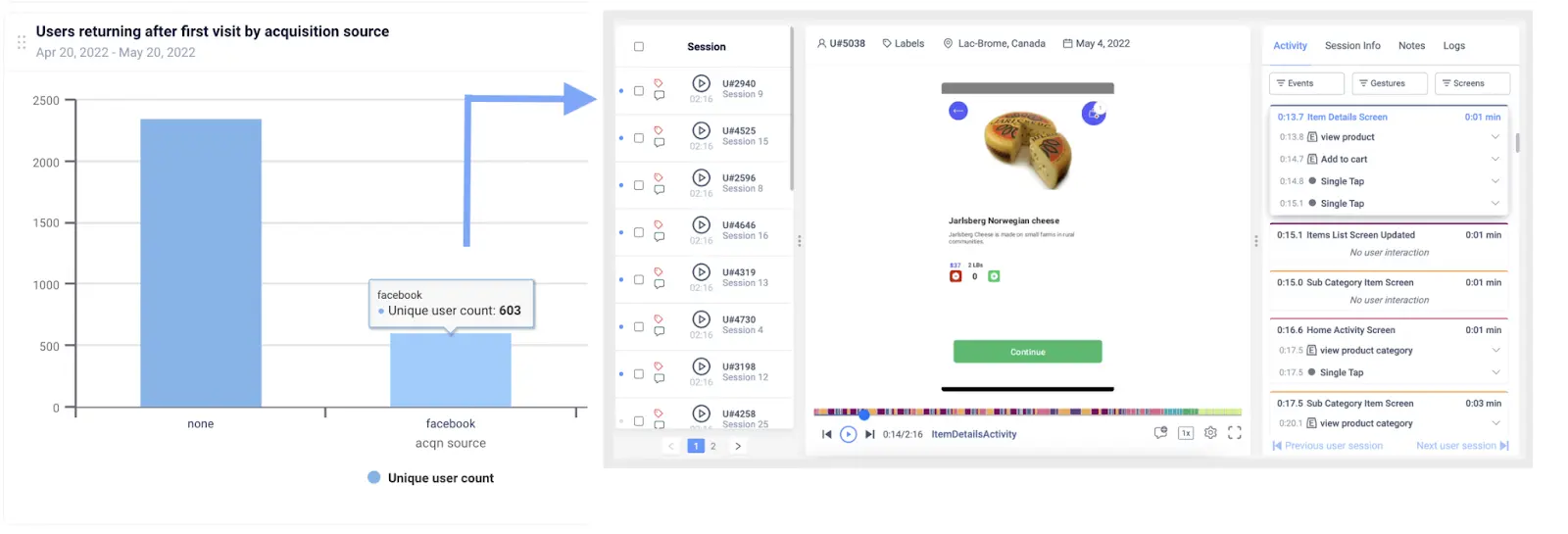 With UXCam, you can define key metrics, build custom dashboards, and optimize the product-market fit. You can also track crashes and user frustration to identify and address customer pain points.