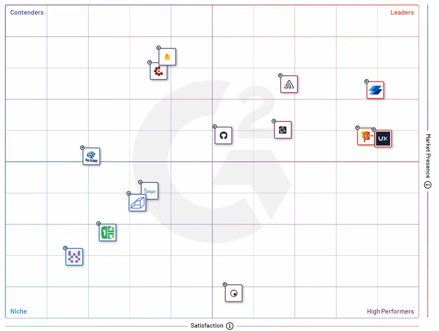 In this map, the Satisfaction axis is determined by a product’s G2 reviews and the Market Presence axis is determined by 15+ data points ranging from website traffic to G2 searches. It helps G2 users get a broad view of the software landscape to easily compare tools.