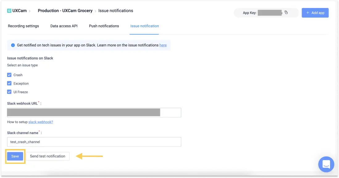 If you don't want to miss any technical issues and you want to react quickly, turn on the Slack notifications in UXCam and choose to receive notifications for Crashes, UI Freezes, or/and Handled Exceptions.