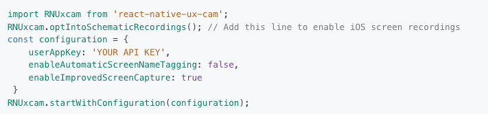 Next is configuration. Once installed, import RNUxcam from 'react-native-ux-cam' and initiate a configuration object within your App.js at the start of your app. You can find your App key on the UXCam dashboard. Below is an example of how to proceed: