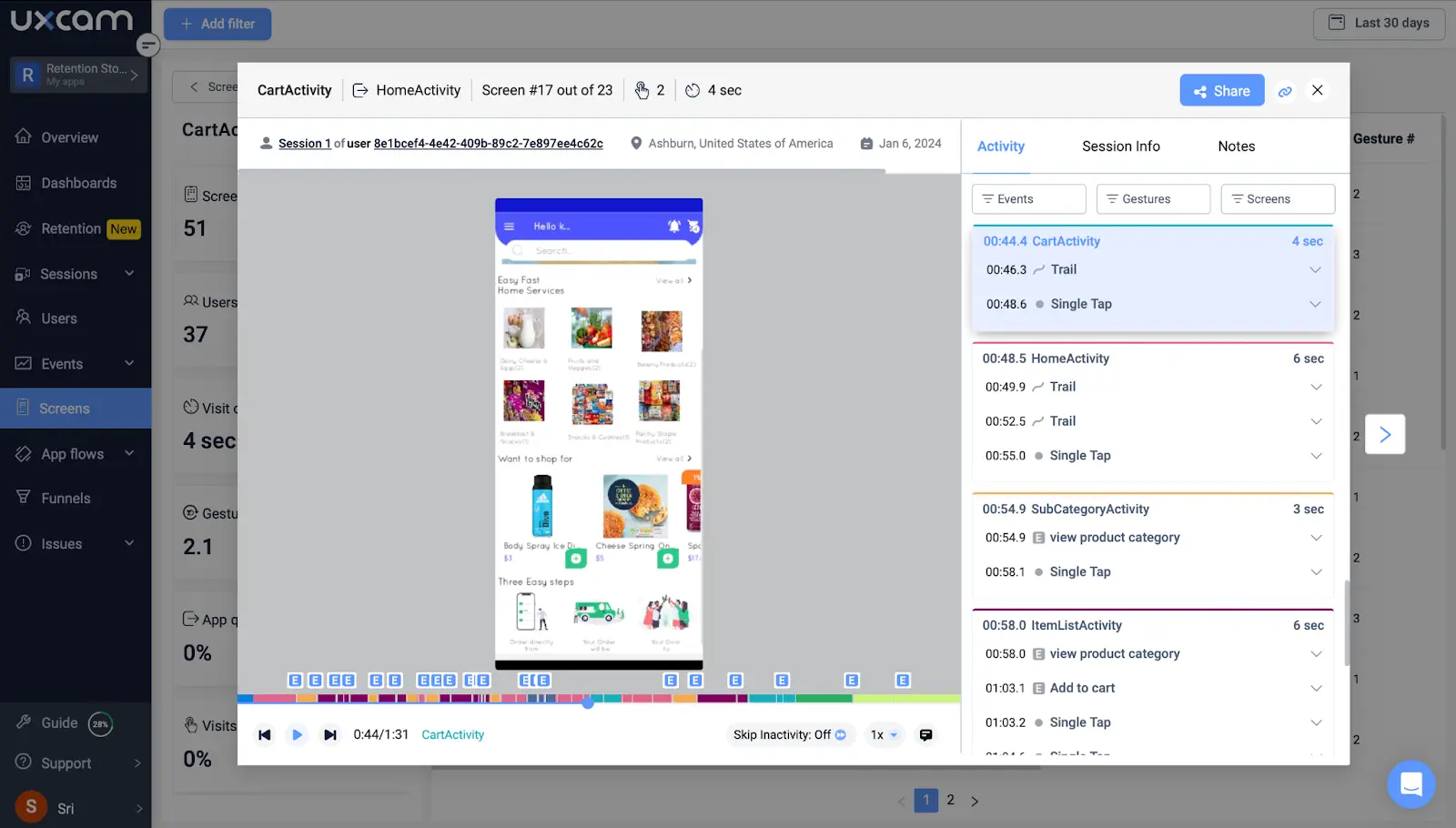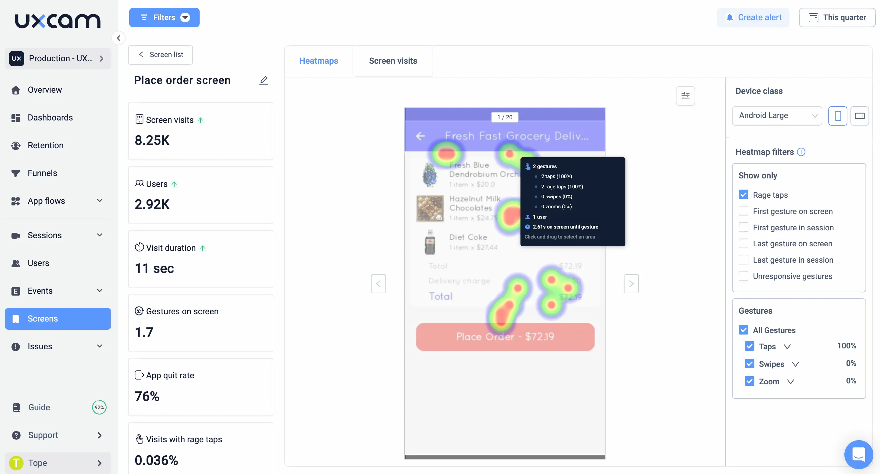 Try this with UXCam: Identify users showing signs of disengagement (e.g., rage taps, drop-offs) and trigger timely interventions based on behavior data.