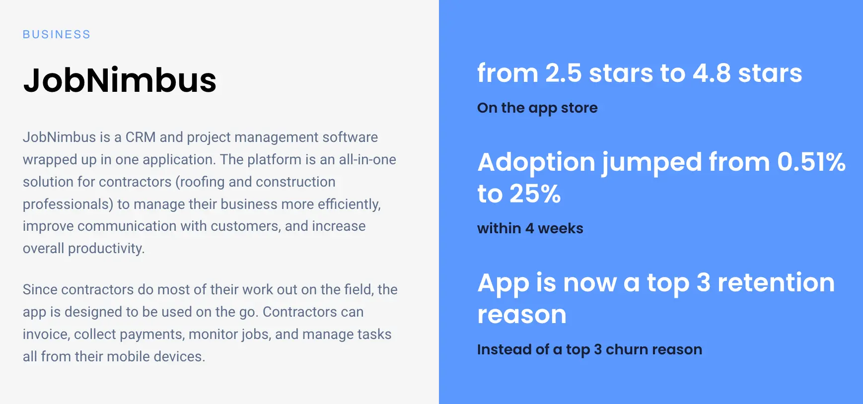 JobNimbus, a CRM and project management software for contractors, aimed to improve their mobile app's user experience, as it was a top reason for customer churn.