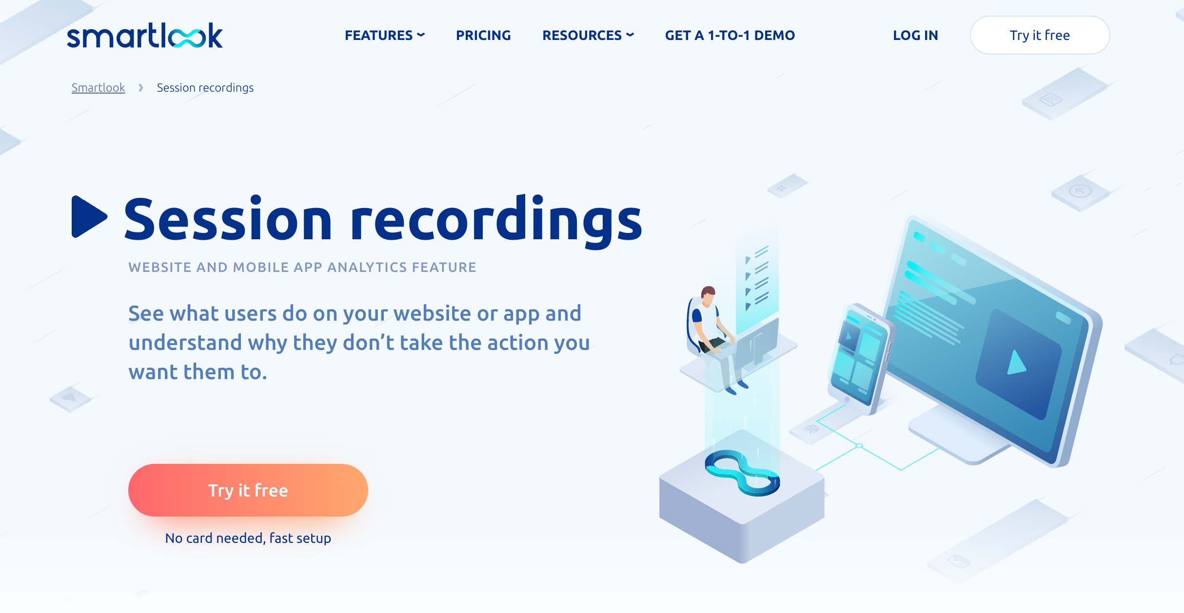 Smartlook is an analytical solution for websites, mobile applications, and application frameworks. It enables product teams to track user engagement across product platforms. With features like automatic event tracking, heatmaps, and session recordings, teams can analyze - and optimize - customer journeys.