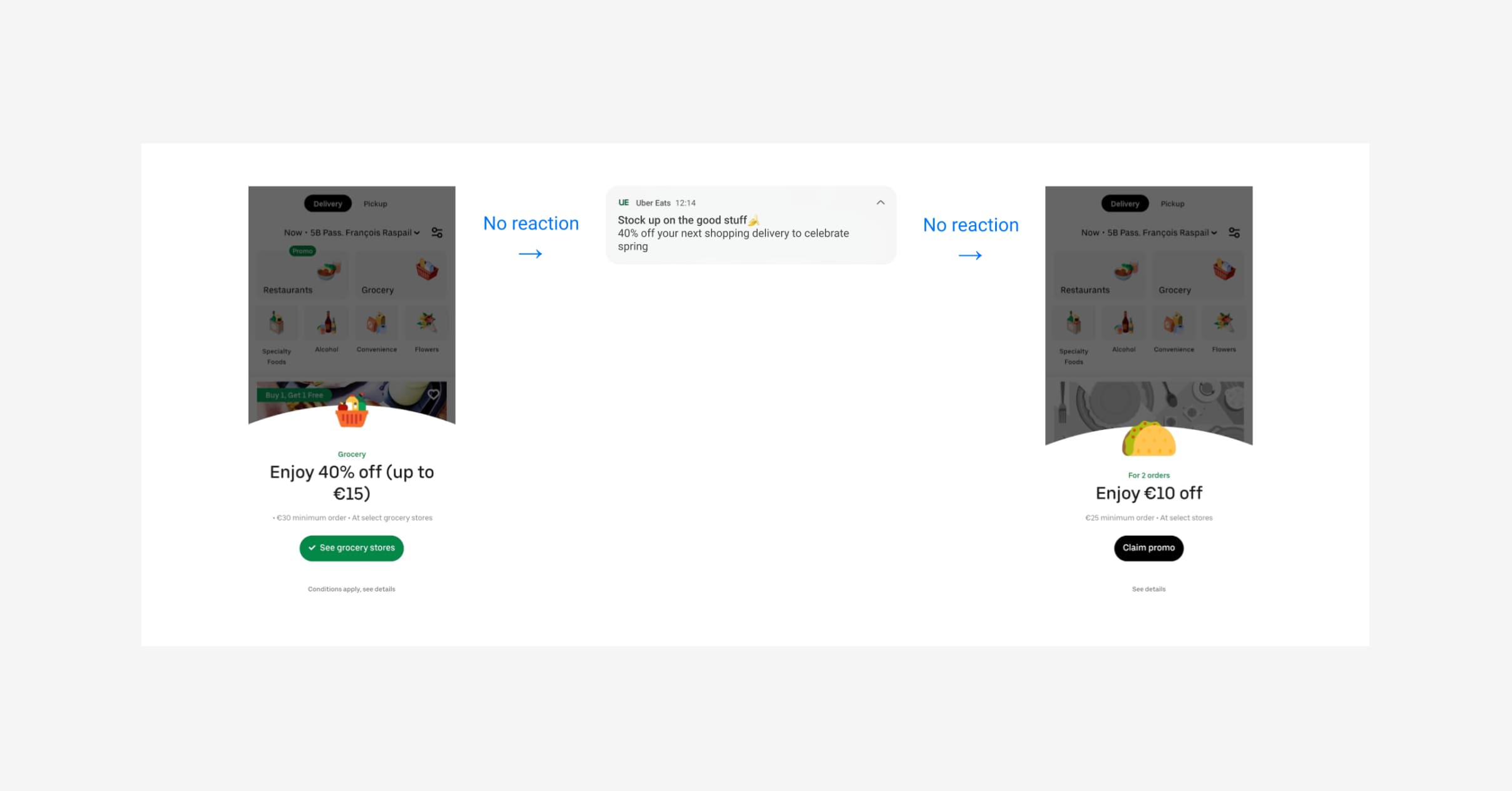 Uber Eats displays current promos in in-app messages. If a customer ignores them, they send a push reminder. If the latter is ignored, the app changes the offer promoted after the app open.