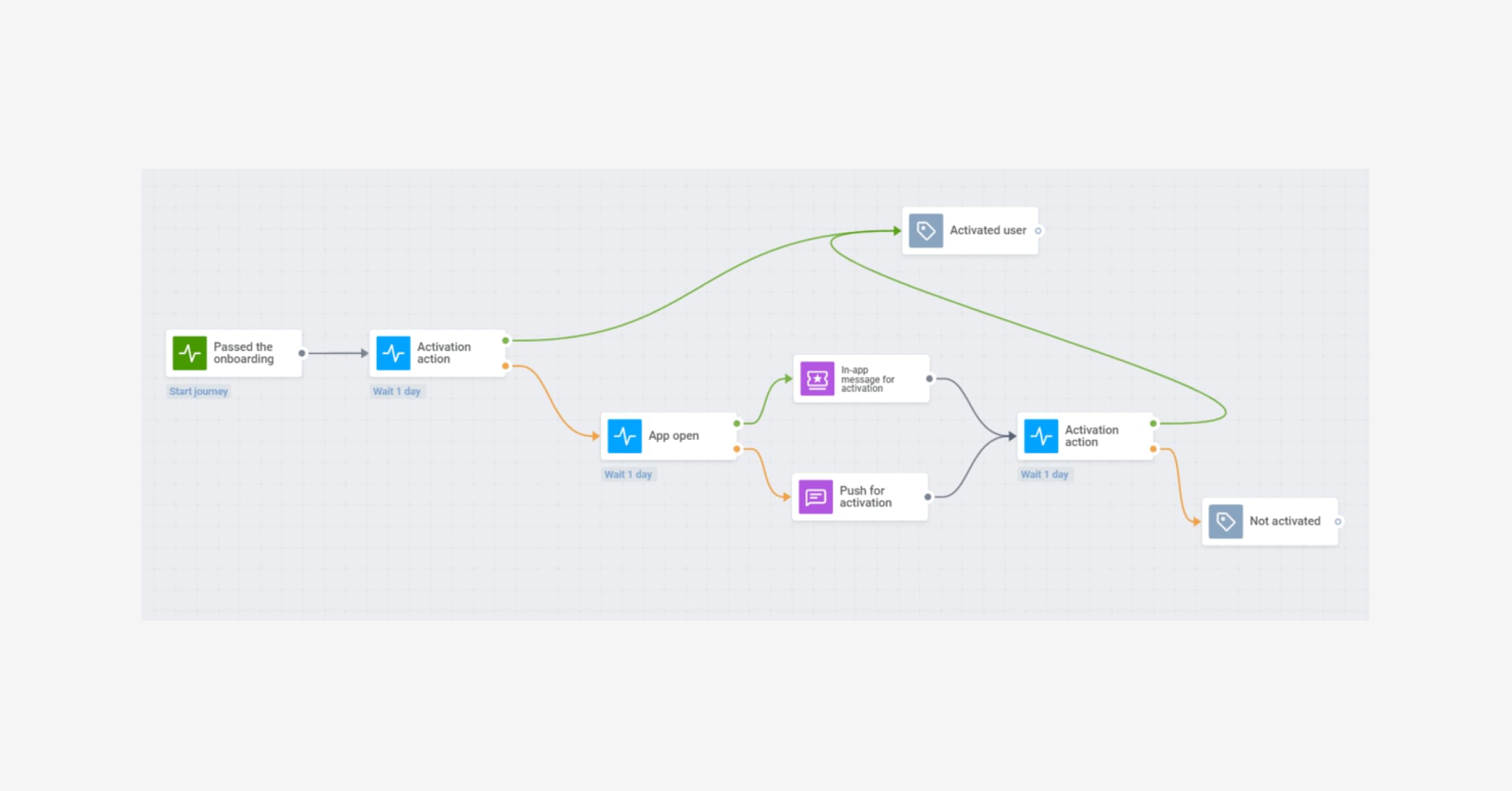 1. You will target users who have passed through your app onboarding flow 2. Then wait for them to take the activation action 3. If a user doesn’t trigger the activation event shortly, you can nudge them with an in-app message 5. If the user is still active in the app; send a push notification 7. If the customer has stopped engaging with the app, send an email 8. Check if your mobile customer has become activated after receiving these messages