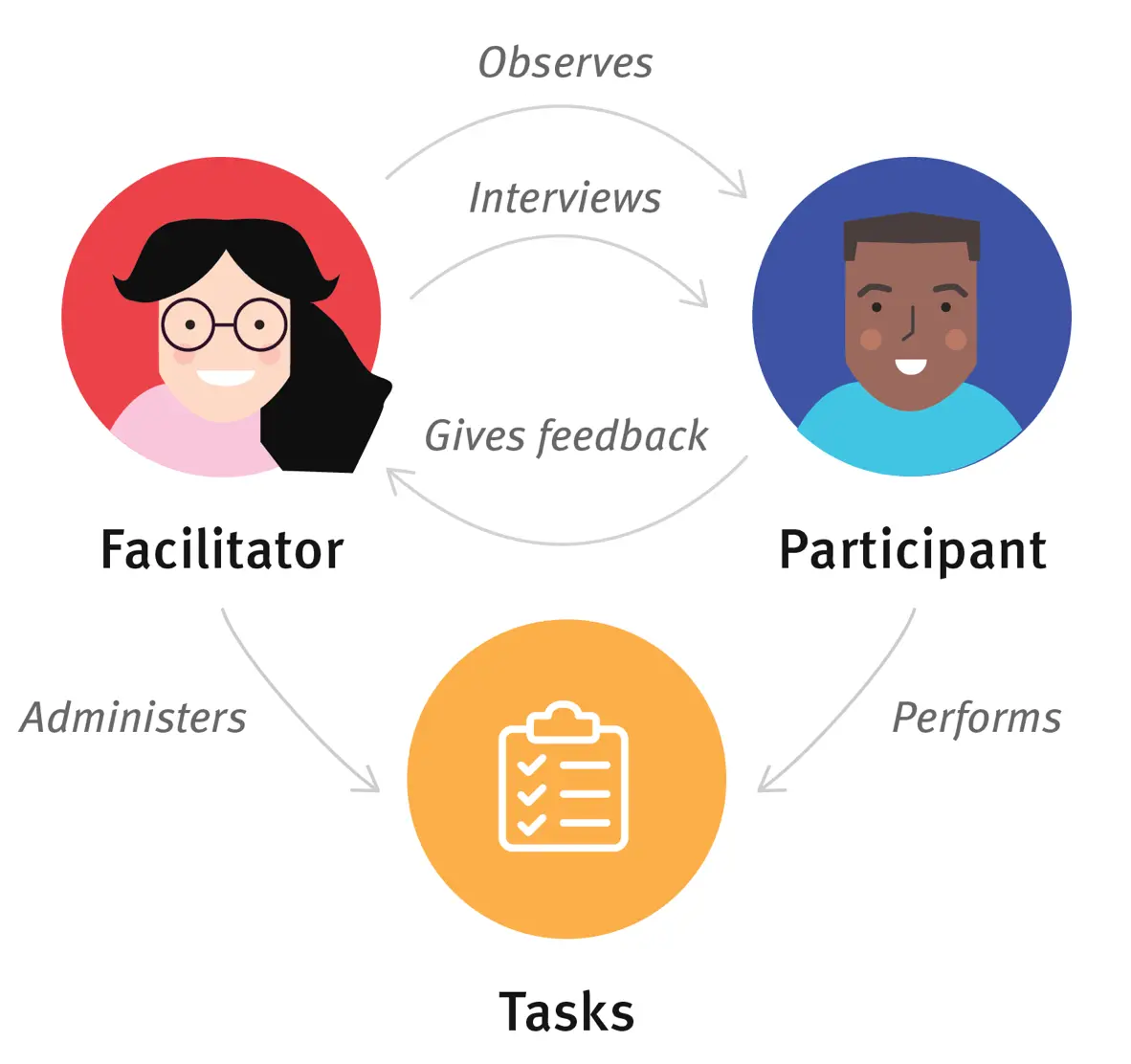 In a nutshell, a usability test session comprises a participant and a facilitator who issues tasks for the participant to complete and observes how they use the app to complete the tasks.