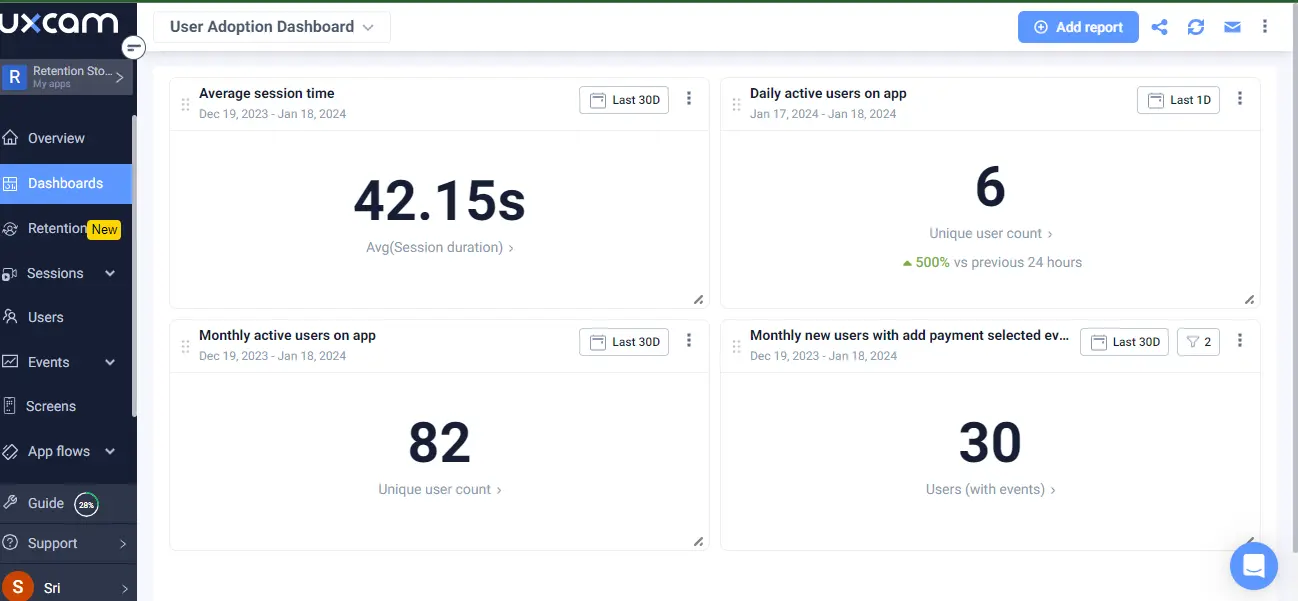 At UXCam, we’ve worked hard to make our dashboard feature flexible—it’s easy to create user adoption dashboards that support a wide range of use cases. In this guide, we’ll give you a thorough overview of user adoption dashboards and introduce you to a few use cases that will help you get started.