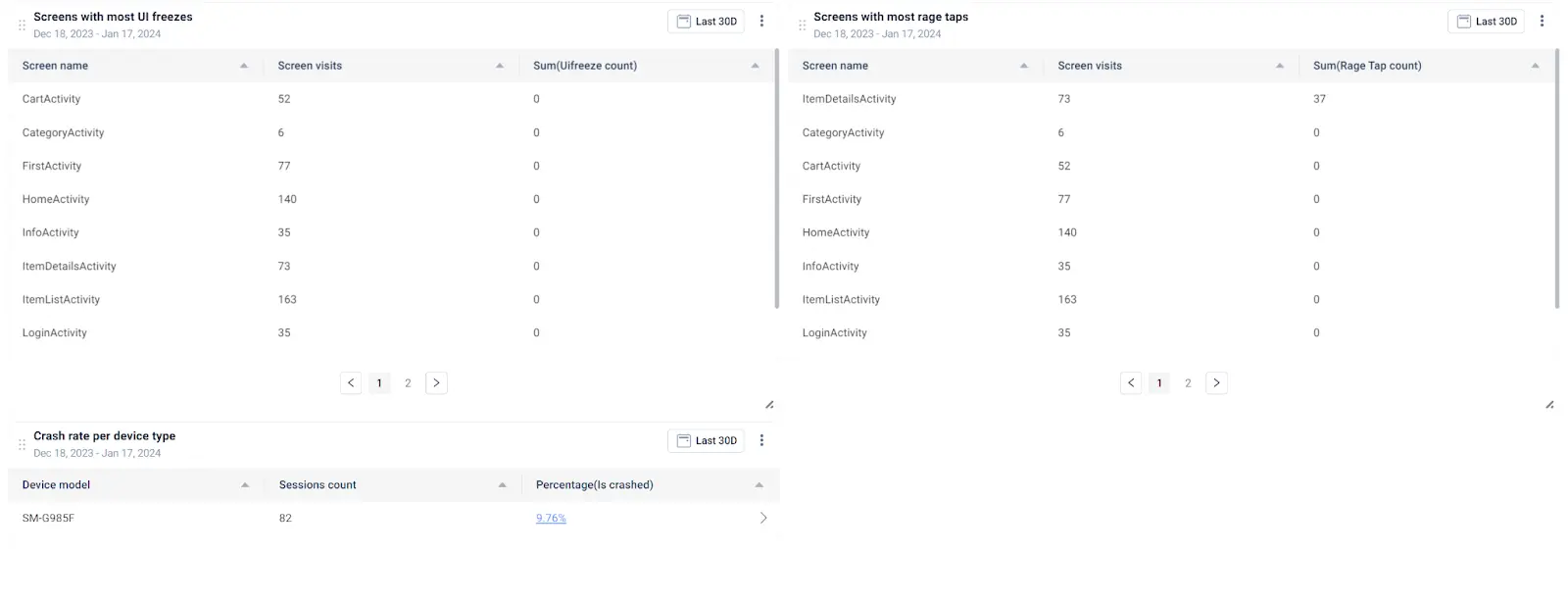 Another valuable use case is monitoring issues (UI freezes, crashes, etc.) and user frustration. As a general rule, fewer issues leads to less frustration—which ultimately improves user adoption.