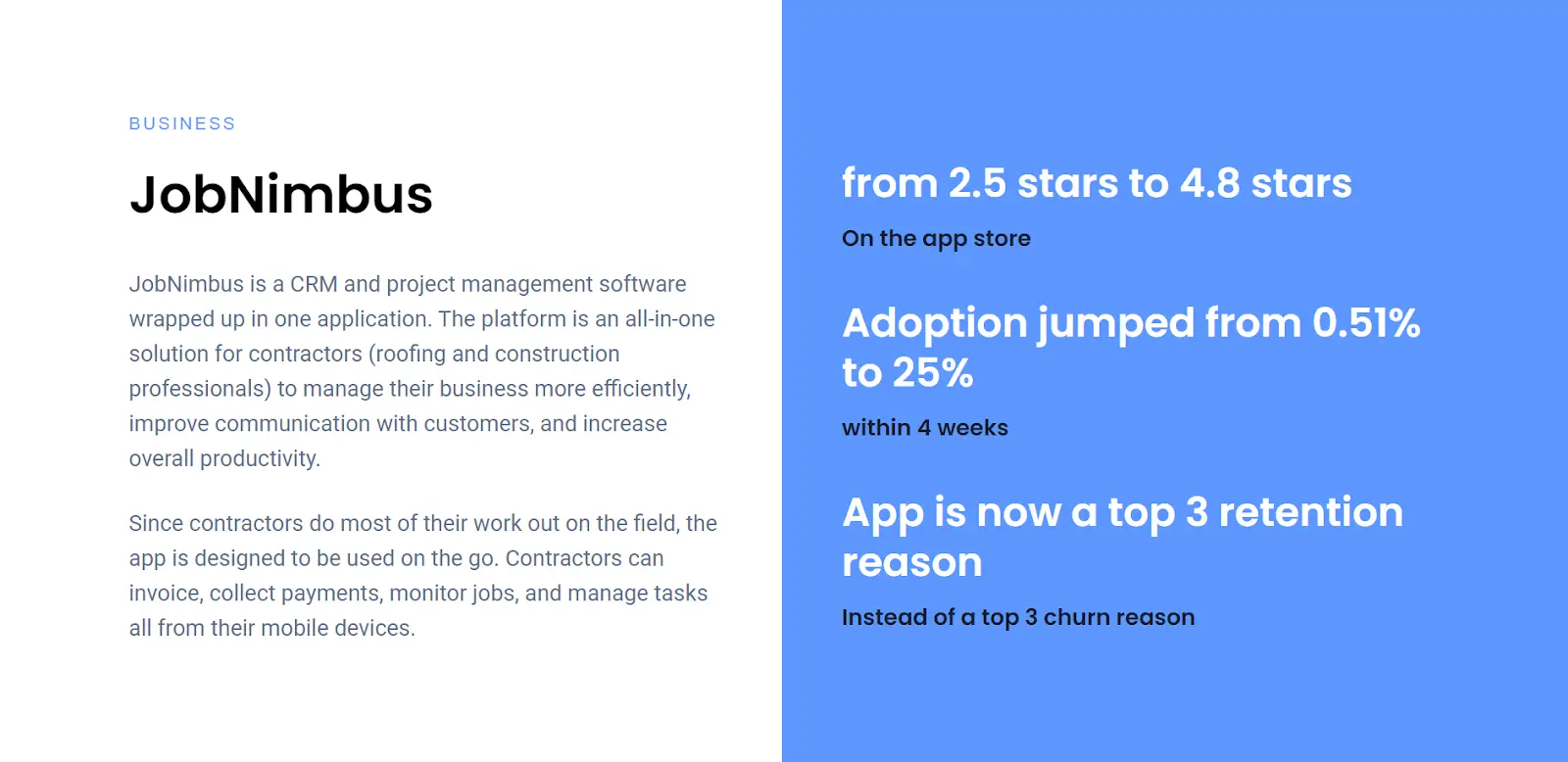 JobNimbus is a cloud-based project management and CRM software for contractors. And their mobile app was (at one point) a top-three reason for churn—not ideal. They smartly called for a complete redesign and turned to UXCam for help validating their ideas.