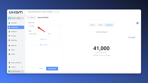 First, open the retention tab inside UXCam. Then, press "Create report".