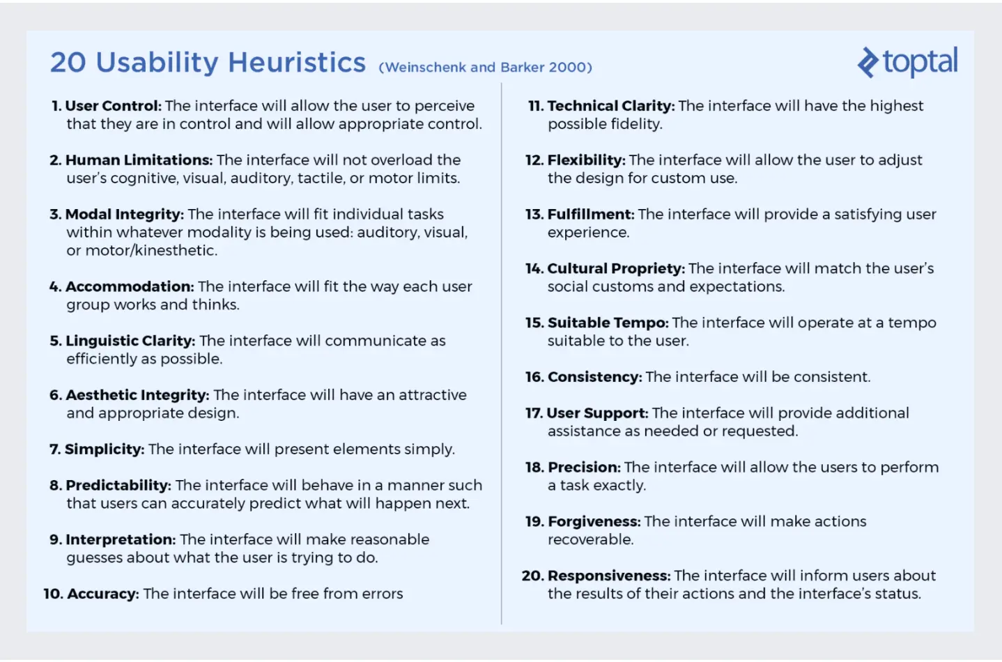 Consider the core design rules of thumb using a Heuristic evaluation. These are standards, conventions, and best practices to enhance your app’s usability. It can be used as a guideline to see how usable each user flow step or process is.