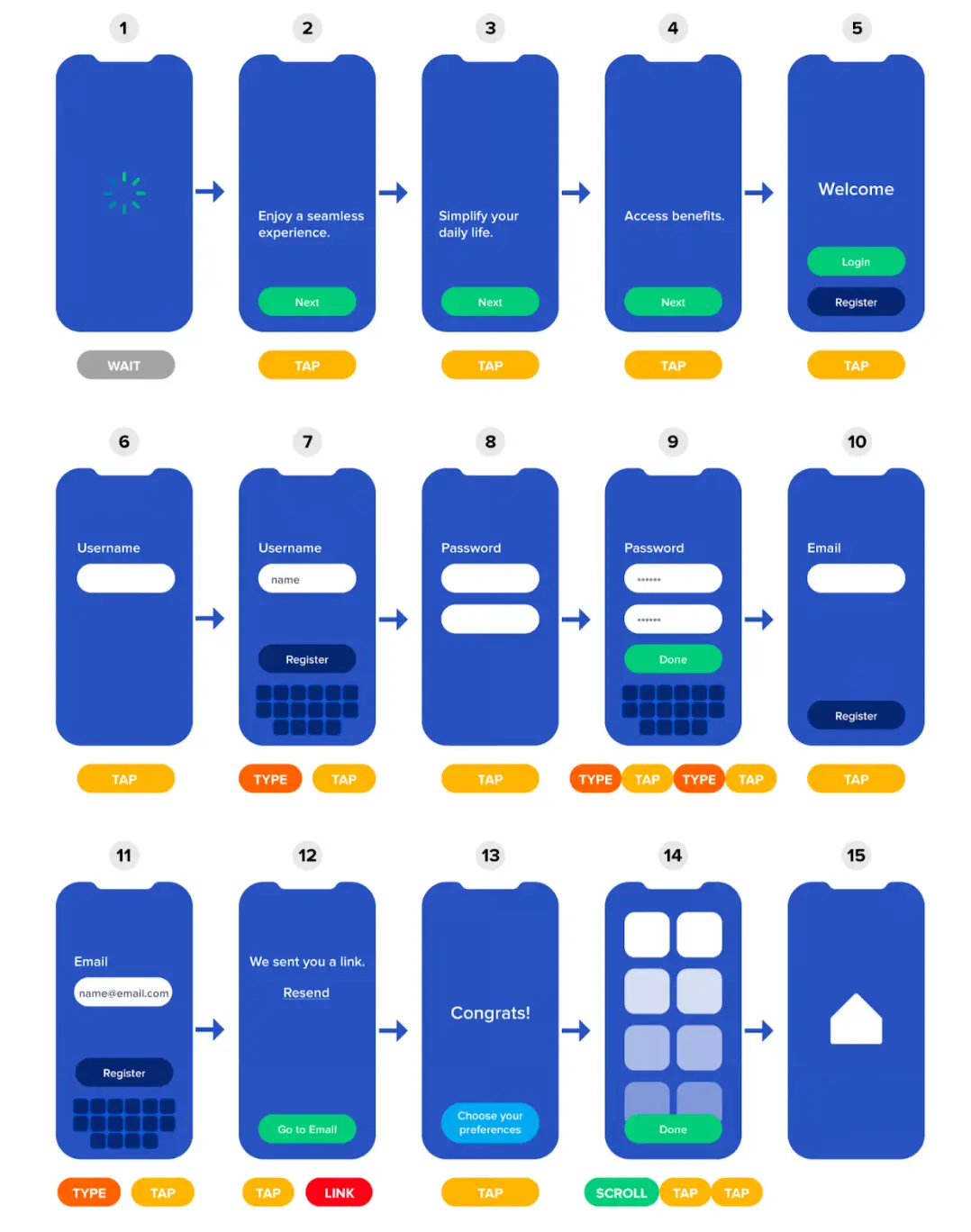 For an idea of how you can present your flow, the example below is of an onboarding flow labeled with the user’s actions: