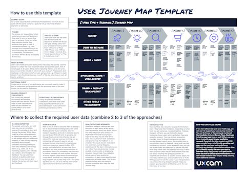 There is more than one way to do it right and design a great user journey map. Every organization and industry has its own templates, tools and approaches to what elements are most important to them. The following examples and template will give you an idea of what a user journey map can look like if you decide to create one yourself. Make it your own, and change up the sections and design so they make sense for your product and use cases.