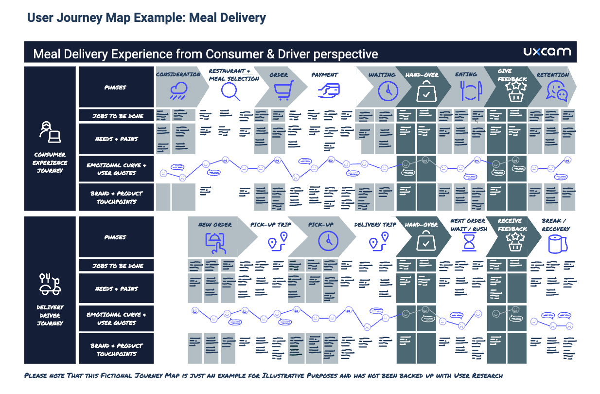 User journey map example: meal delivery. Please note that this fictional journey map is just an example for illustrative purposes and has not been backed up with user research.