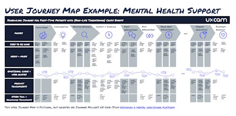 This user journey map is fictional but oriented on Johanne Miller’s UX case study Designing a mental healthcare platform.