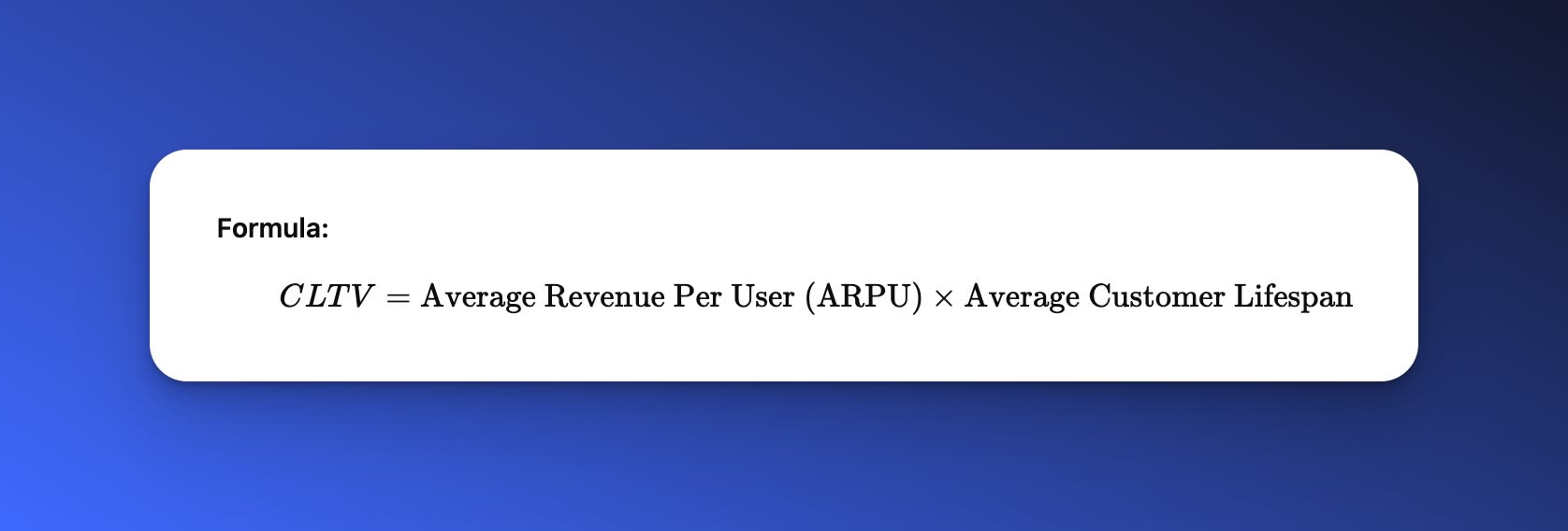 For instance, if your average user pays $50 per month and stays for 24 months, your CLTV is $1,200.