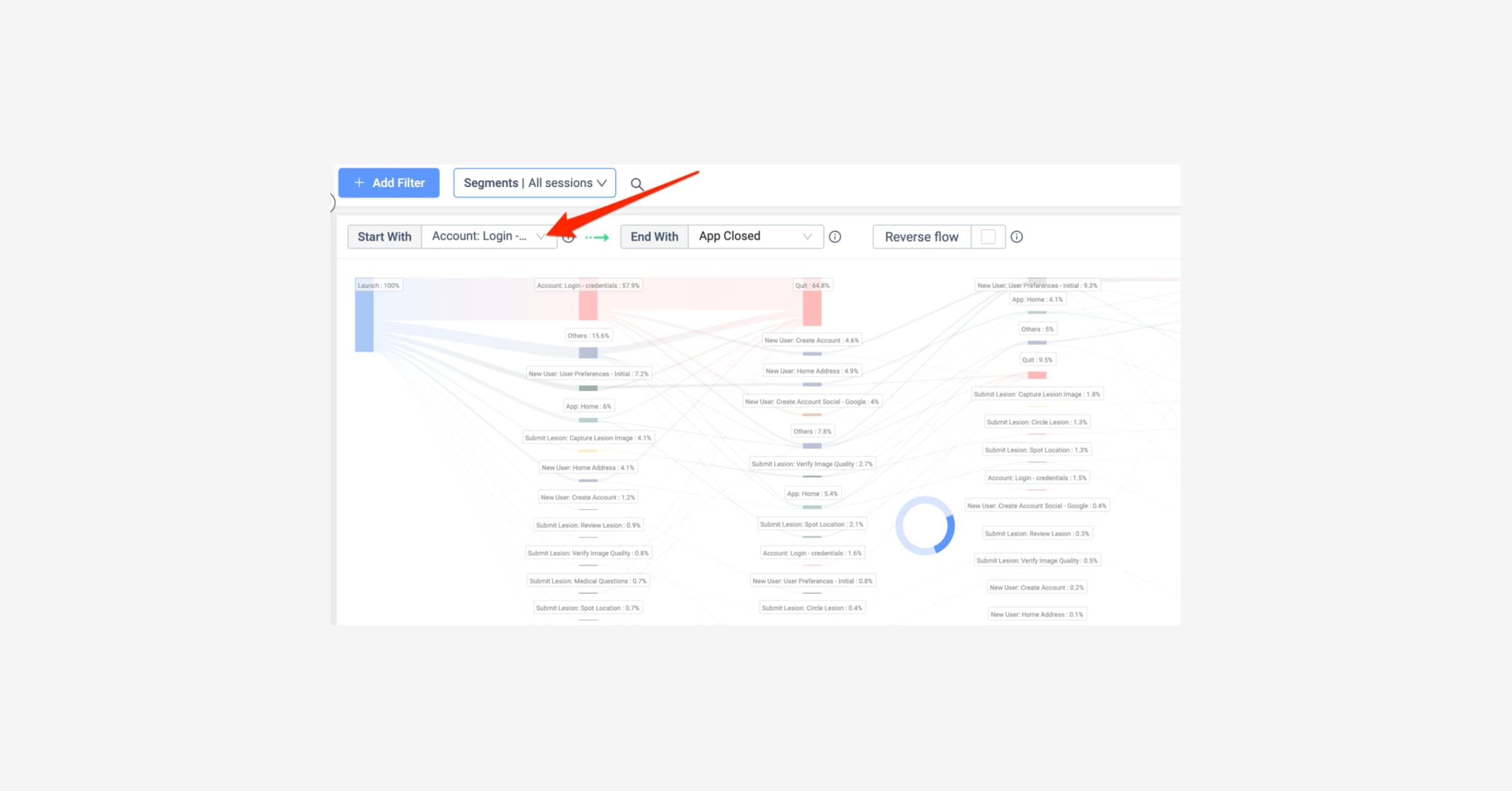 To get the bigger picture, we looked at the screen flow. We saw they were going from login to quitting. It was becoming clearer that users were stopping at the login page. We also saw that some users were logging in just fine, but most were not - so this ruled out many technical issues.