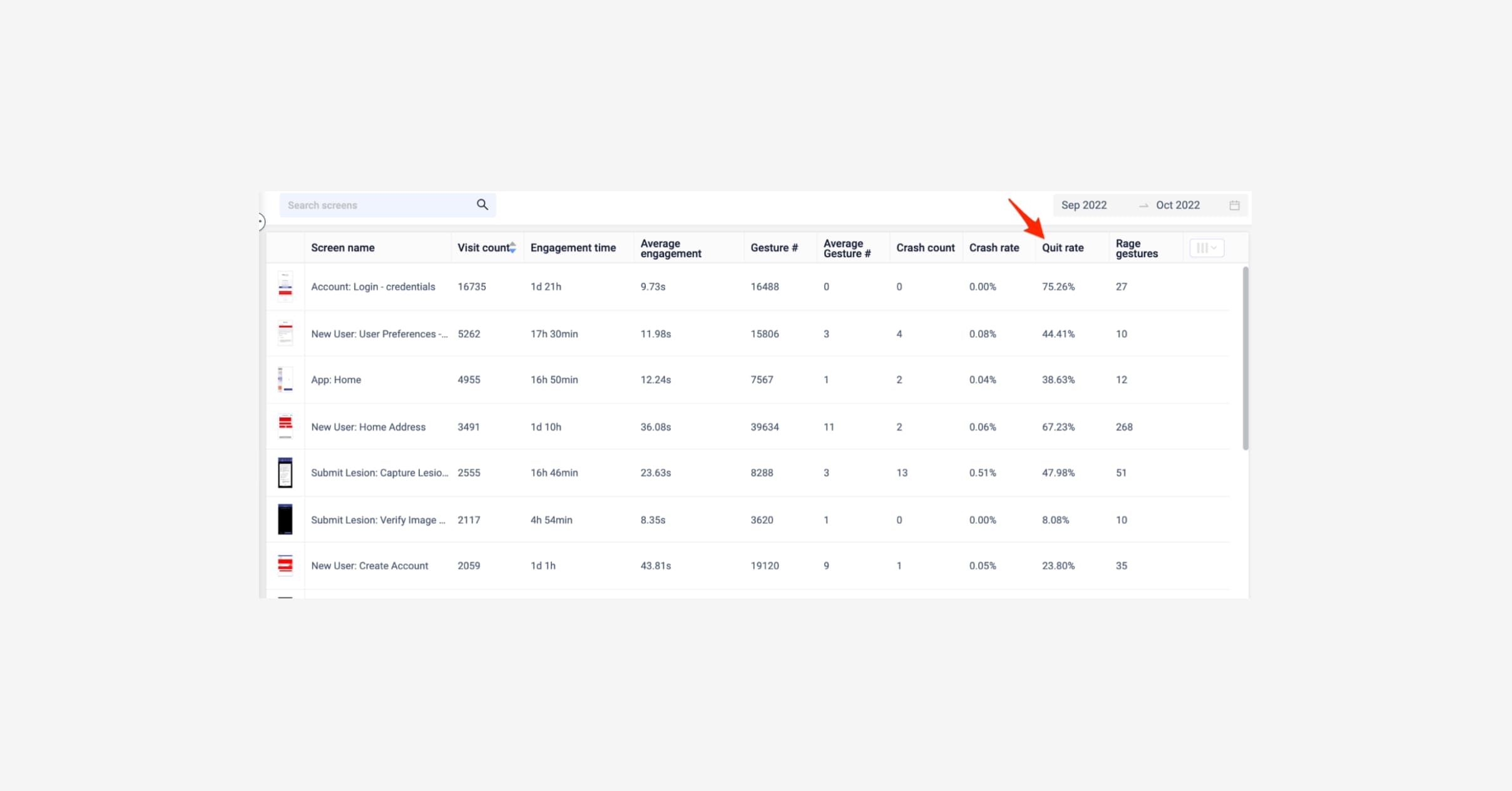 We clicked between the steps to better understand what happened during the sessions. This way we could drill down on the specific list of sessions where the verification process was abandoned. We were able to see overall data on the top of the screen e.g. rage taps, crashes and so on. On this screen, everything looked alright. So far, it looked like there weren’t any technical problems causing the drop e.g. bugs or freezes. We went into the heatmaps dashboard and saw there was an unusually high quit rate.