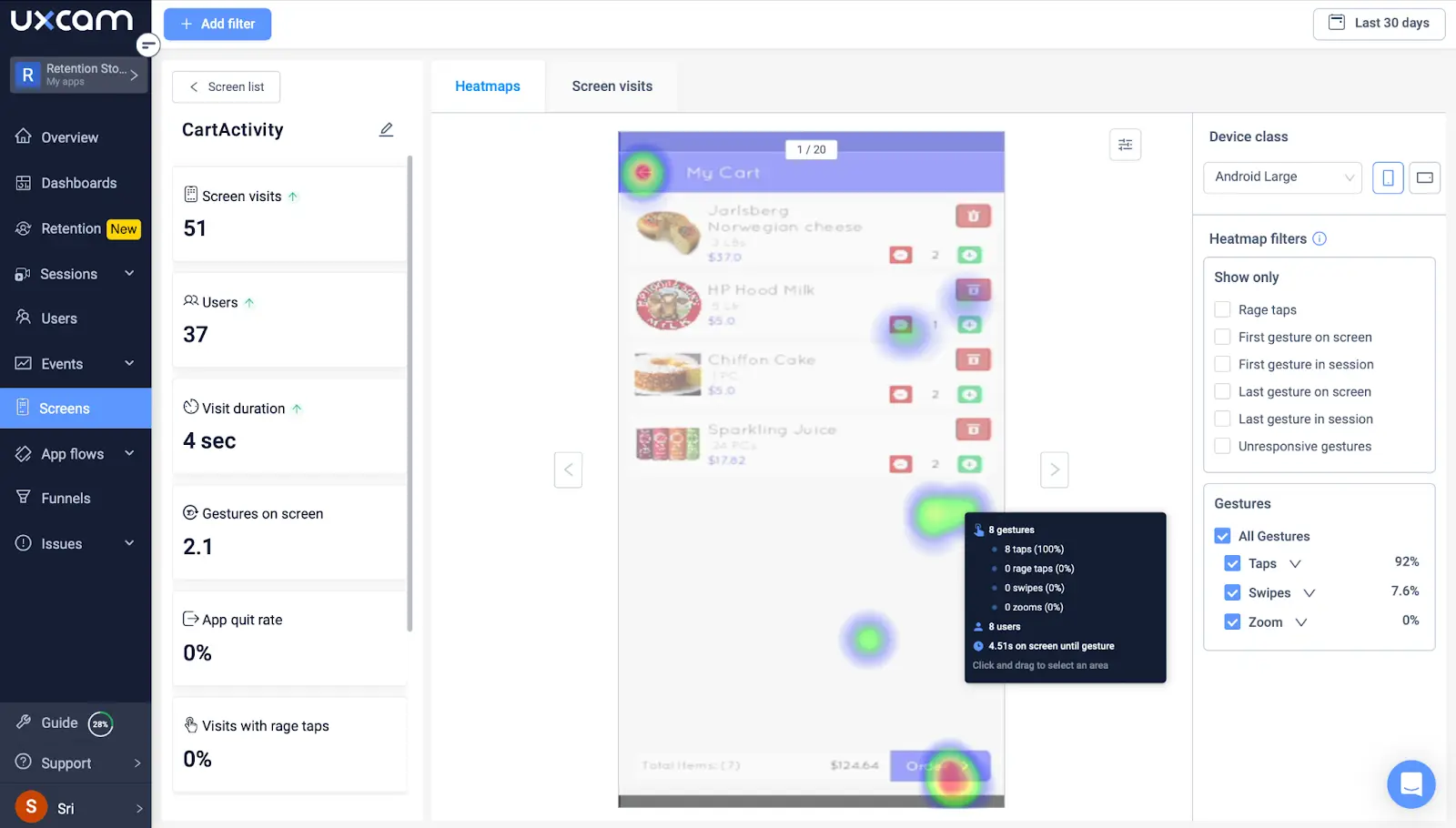 UXCam gives you a bird’s-eye view of where users focus—or where they don’t. You’ll see which elements attract attention, which get ignored, and where users stall. That’s your signal to simplify.