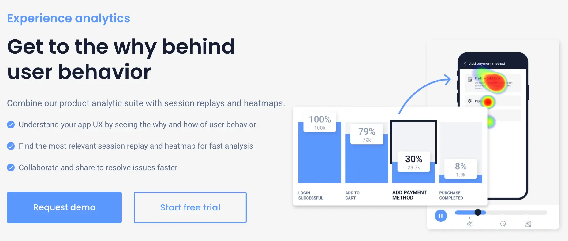 You also get access to heatmaps that will show you the page elements that get used the most, alongside identifying specific frustration signals like rage taps. UXCam is a popular behavior analytics tool designed for mobile apps that helps teams to make confident design decisions based on natural behavior.
