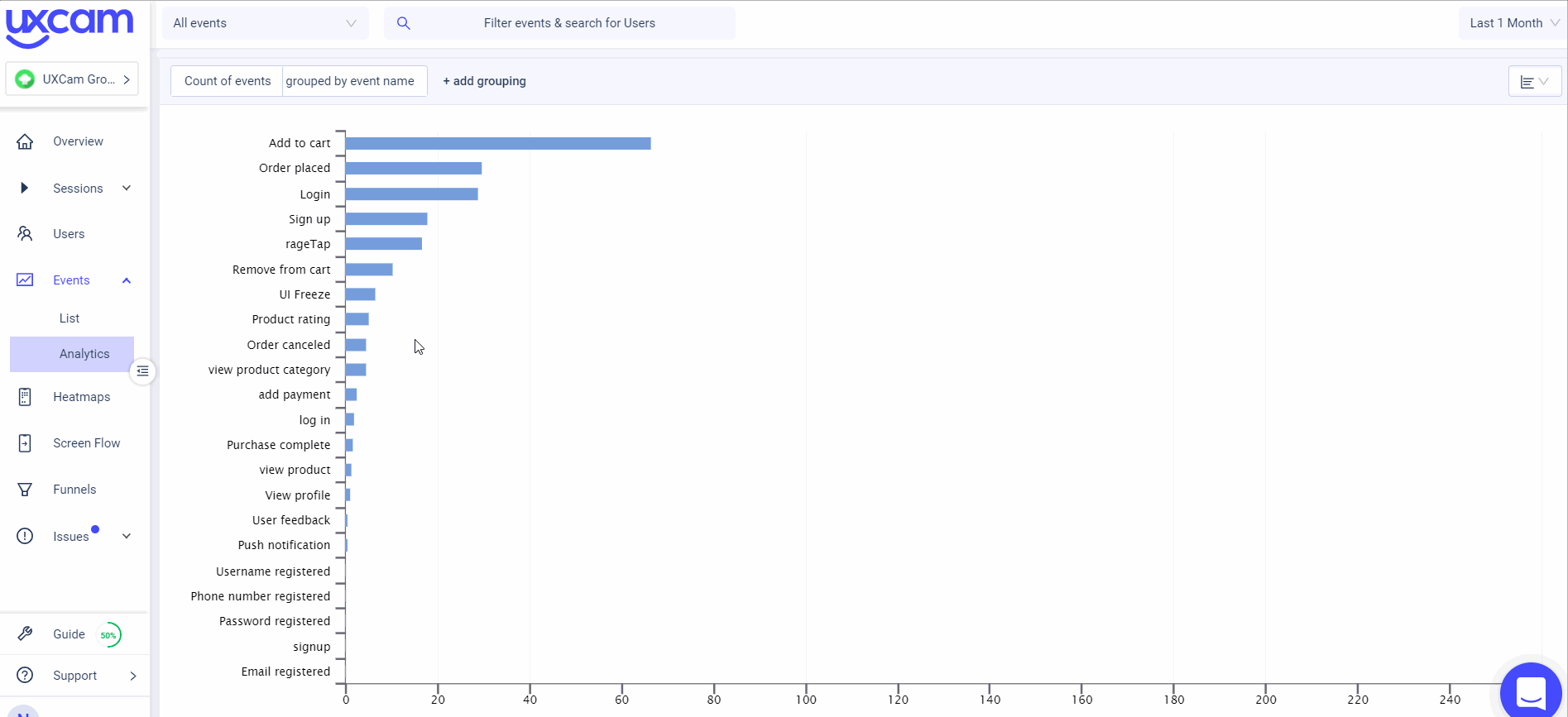 You can measure all aspects of your user behavior by configuring and sending Events to your UXCam dashboard. We see our customers using Event Analytics on a daily basis to track every aspect of their user behavior; UI freezes, user frustration, adoption of new features, conversion steps, and many more.