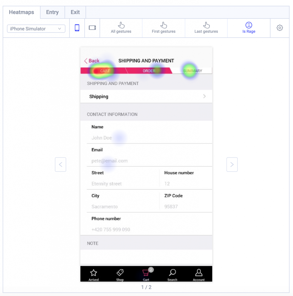 The Rage Tap Heatmap shows a large amount of activity on the “Cart” and “Summary” tab.