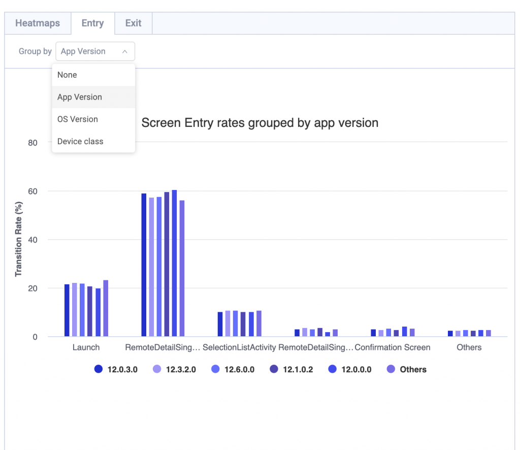 This allows you to see from where users come to the screen and where they leave. You can also see the break down of Entry / Exit by App Version, OS version and Device.