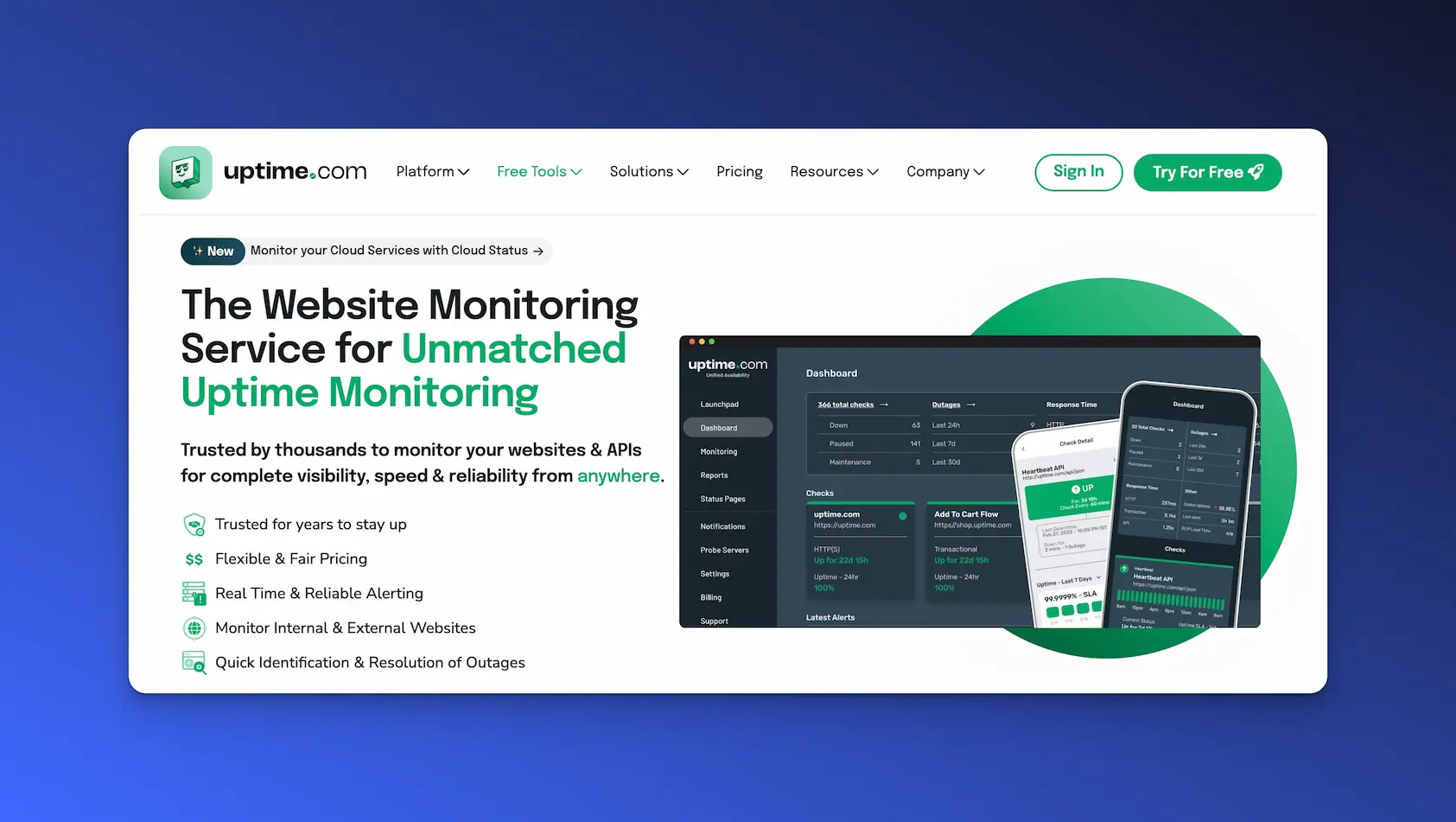 Uptime.com is a reliable website monitoring tool that ensures your site remains accessible and performs well. Known for its ease of use and dependable alerts, it allows teams to detect and resolve issues quickly, making it suitable for businesses of all sizes.