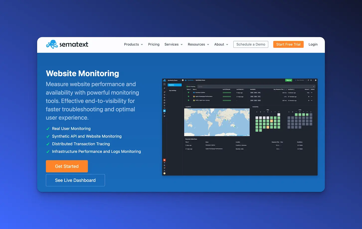 | Sematext | A versatile tool for performance monitoring that includes real user monitoring, synthetic checks, and log management. | Flexible monitoring with robust logging |