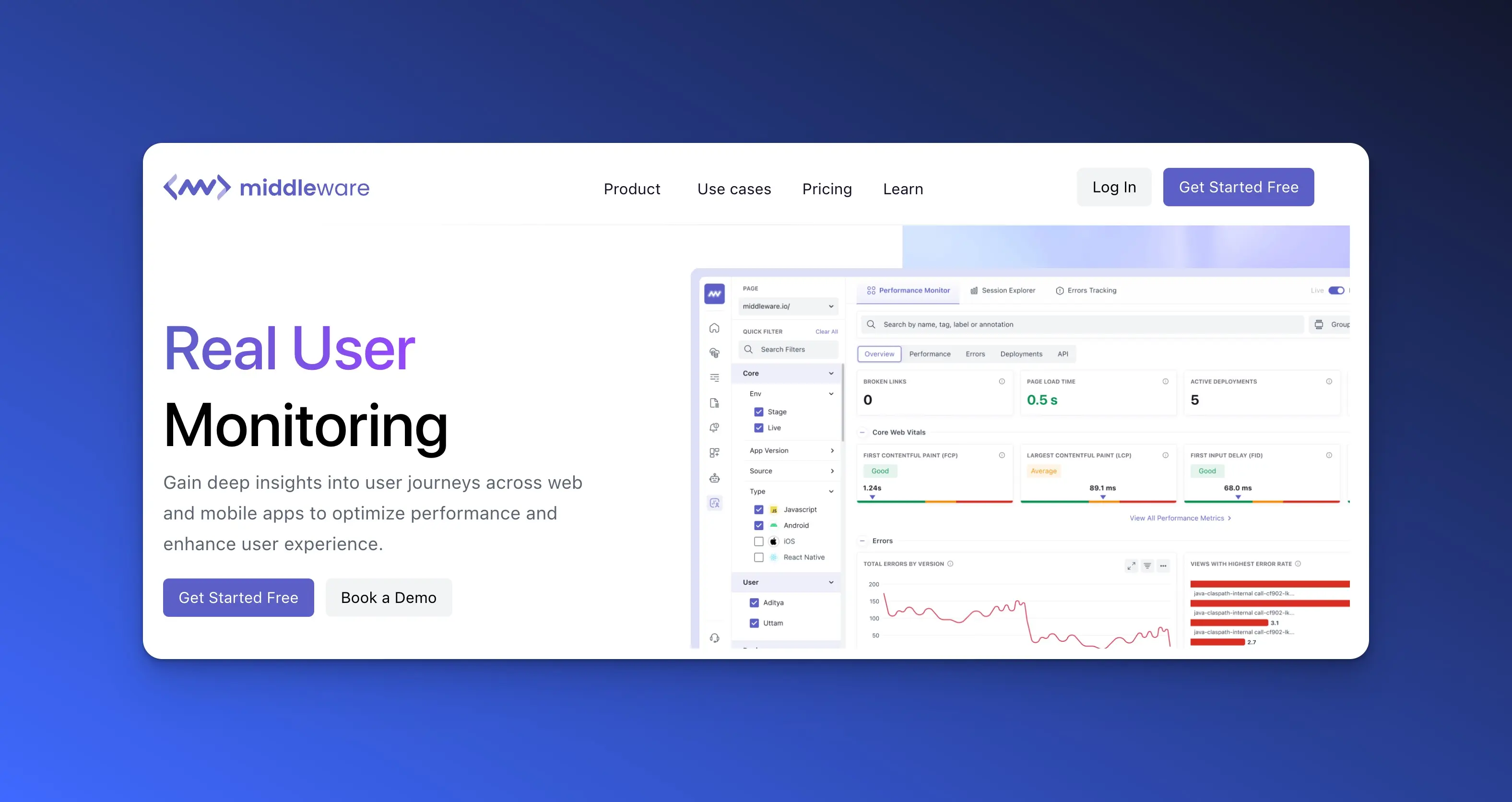 | Middleware | APM and website monitoring tool with real-time insights and error tracking. | Teams needing full-stack performance monitoring |