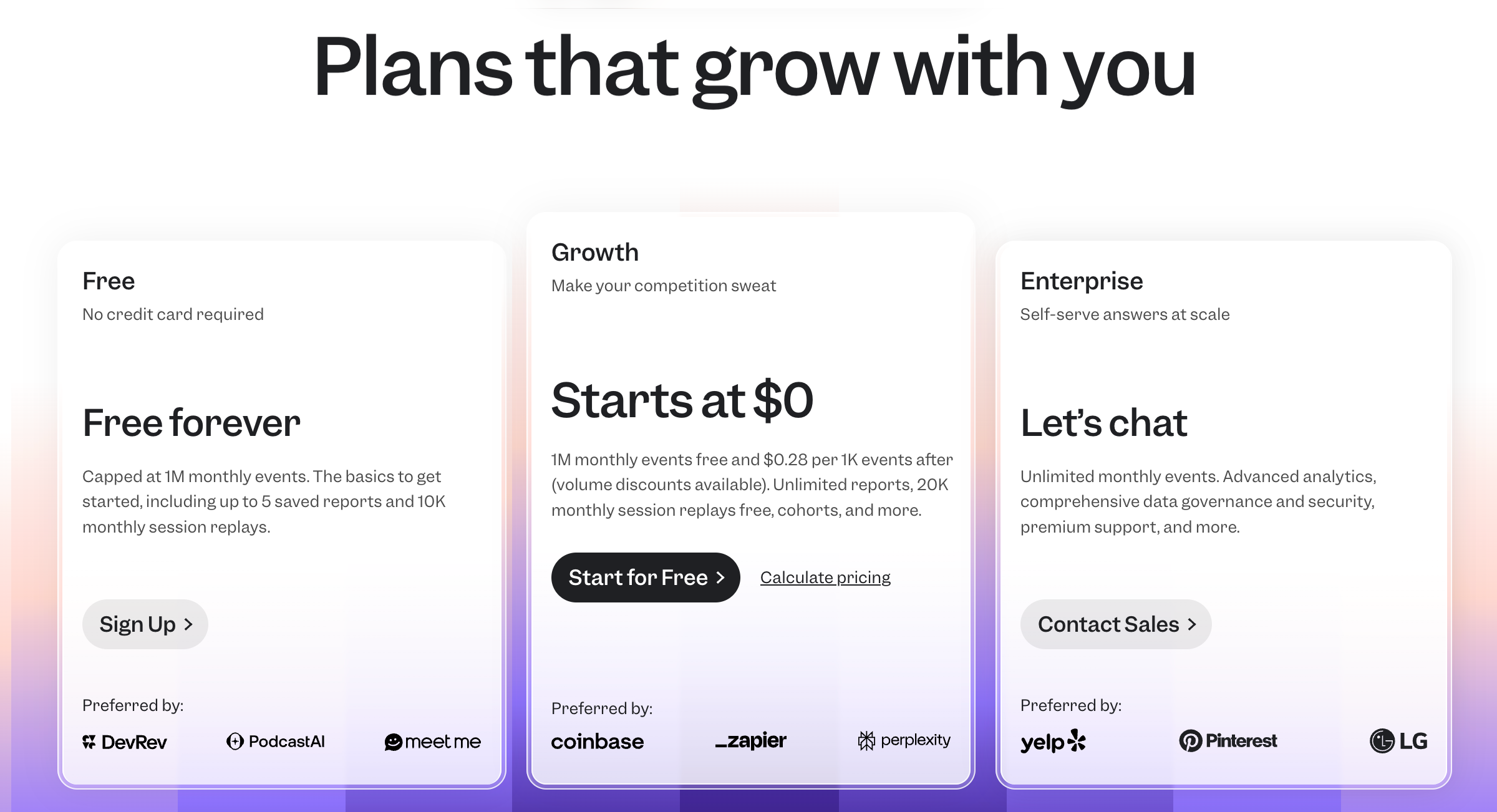Mixpanel offers a free plan with limited data points and reports. Paid plans start with Growth (for scaling teams) and Enterprise (for large organizations needing advanced analytics and support). Pricing varies based on data volume and features.