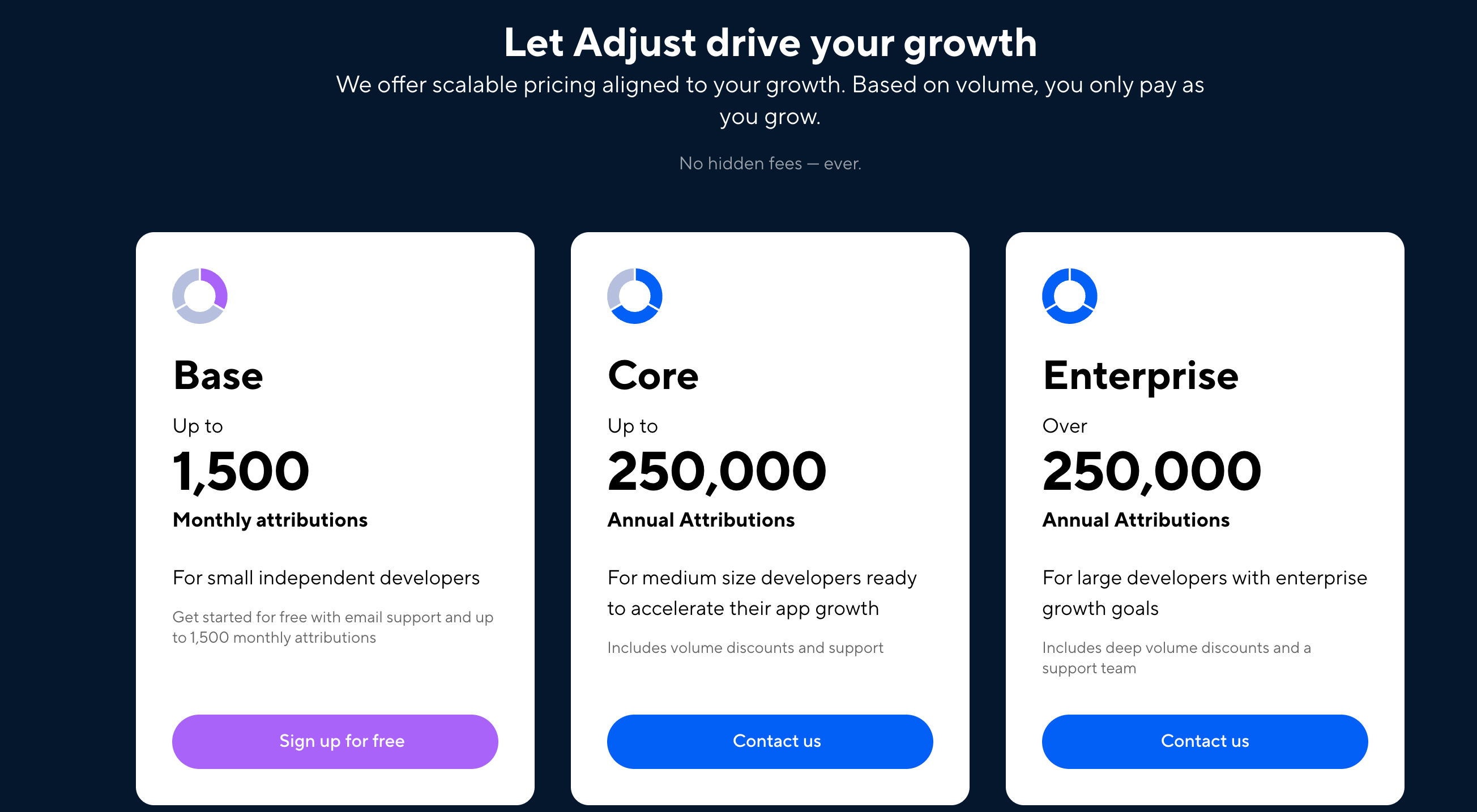 Adjust uses custom pricing based on app volume, campaign activity, and feature selection. Pricing details are available on request.
