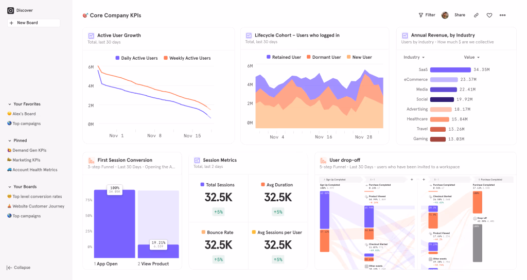 Set up dashboards: Create intuitive dashboards that visualize your key metrics in real time. Prioritize simplicity, highlight critical insights like funnel progress, session durations, or feature adoption trends. Dashboards provide immediate visibility, making it easier for your team to monitor product performance at a glance.