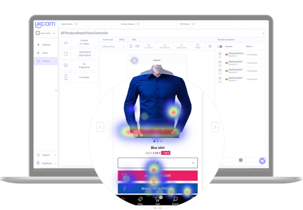 Os mapas de calor fornecem uma ideia de quais recursos os usuários usam para realizar o trabalho. Para evitar assistir a um zilhão deles, comece filtrando por comportamento. Após identificar quais mapas de calor deseja examinar, aprofunde-se e assista a vídeos das sessões reais para obter o contexto completo. Você pode usar qualquer ferramenta de mapa de calor para aplicativos, mas aqui estão os passos caso você esteja usando o recurso de heatmaps da UXCam.