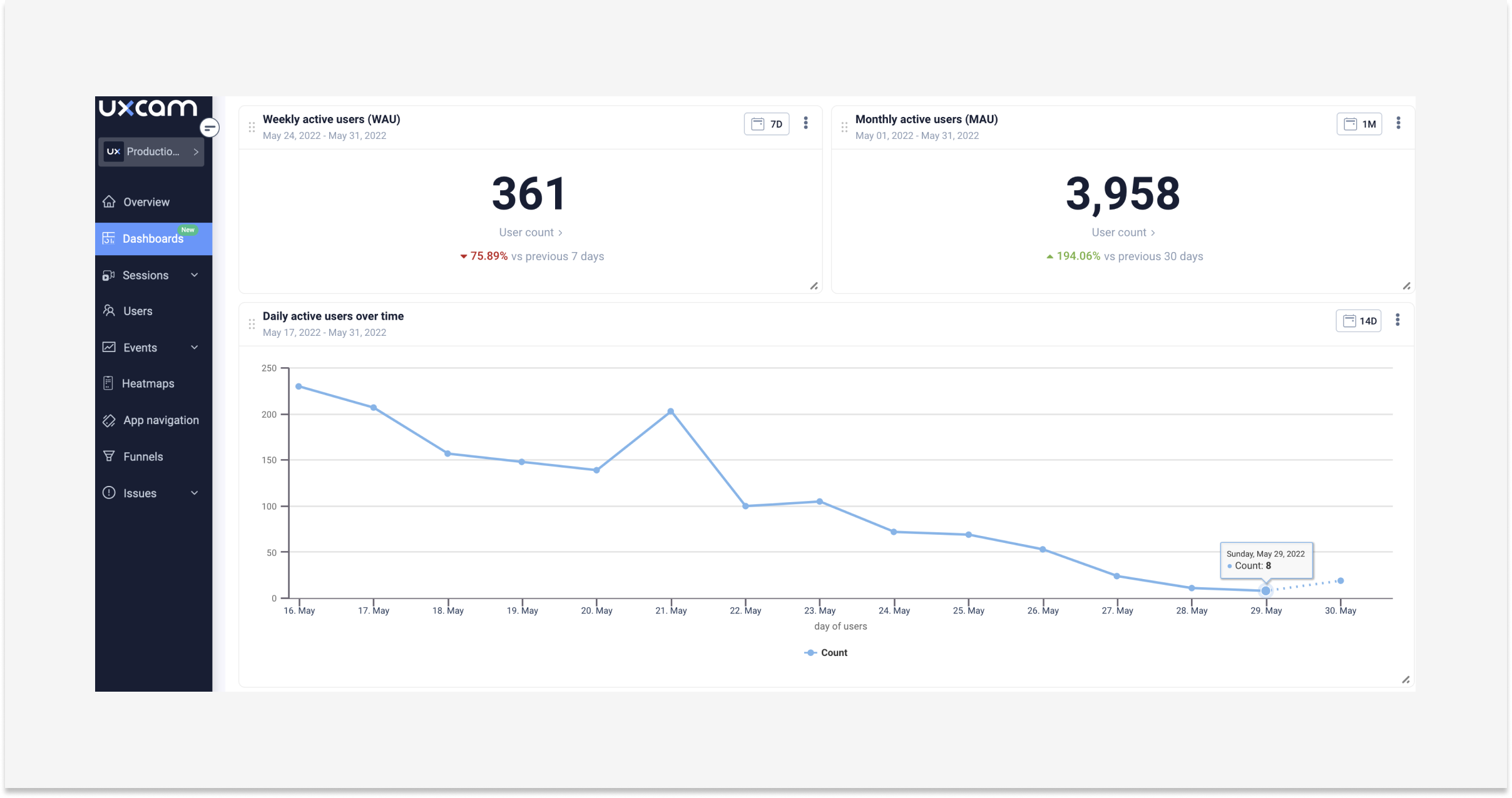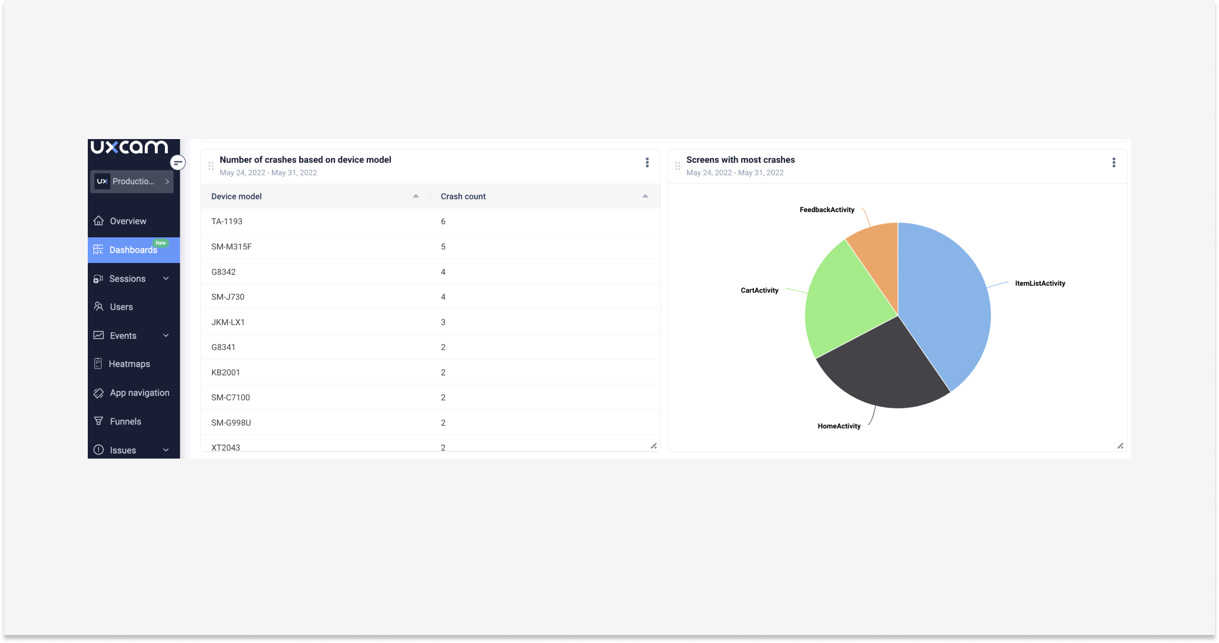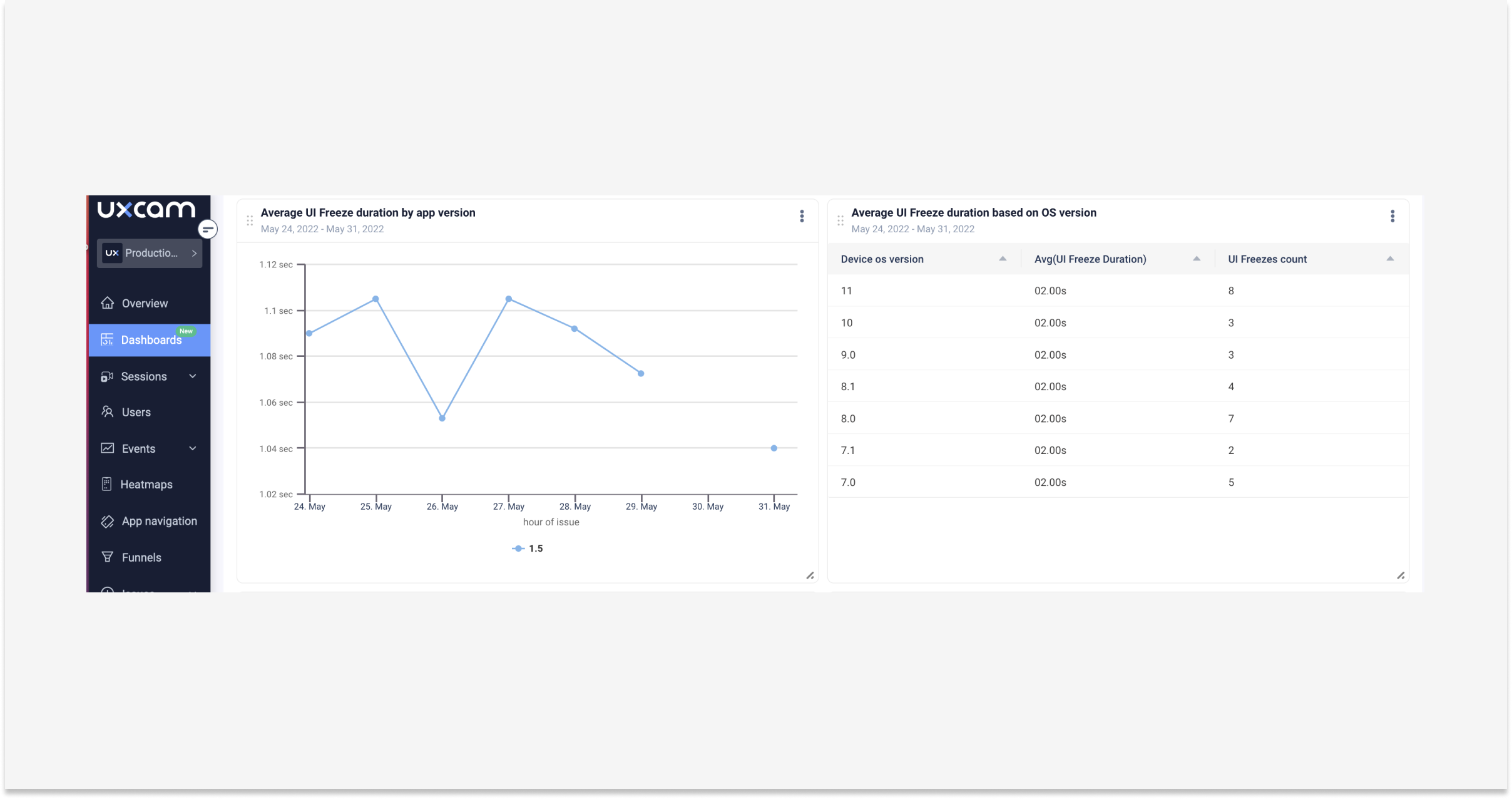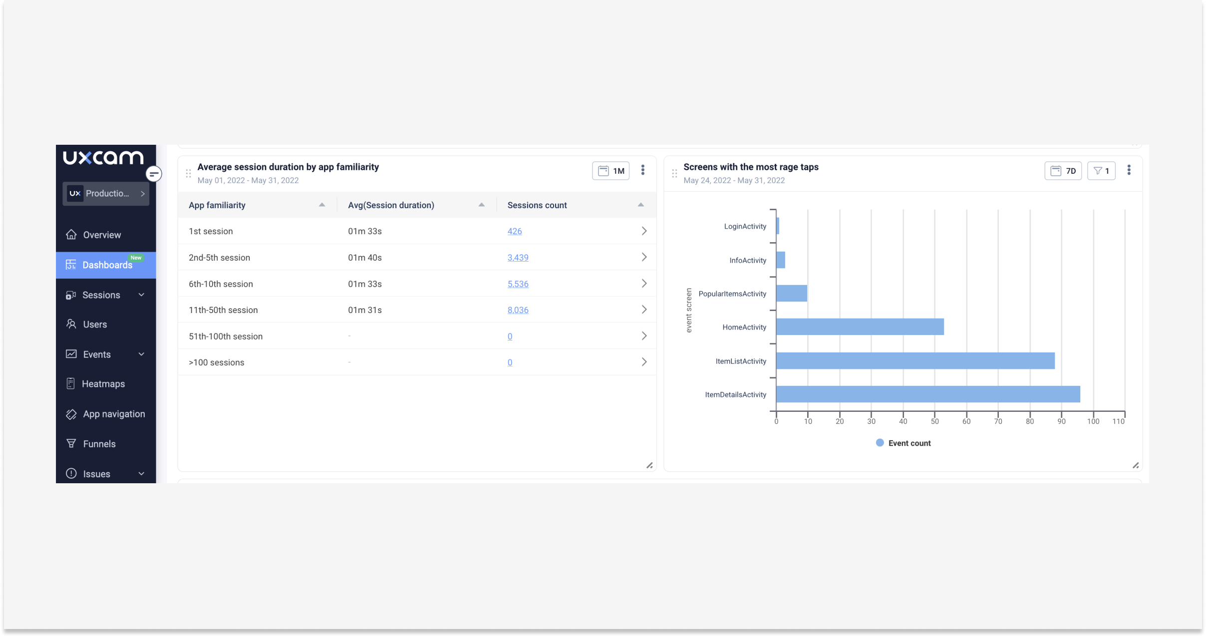 Experimente gratuitamente o novo, personalizável e elegante dashboard da UXCam. Veja como ele funciona ao longo deste artigo.