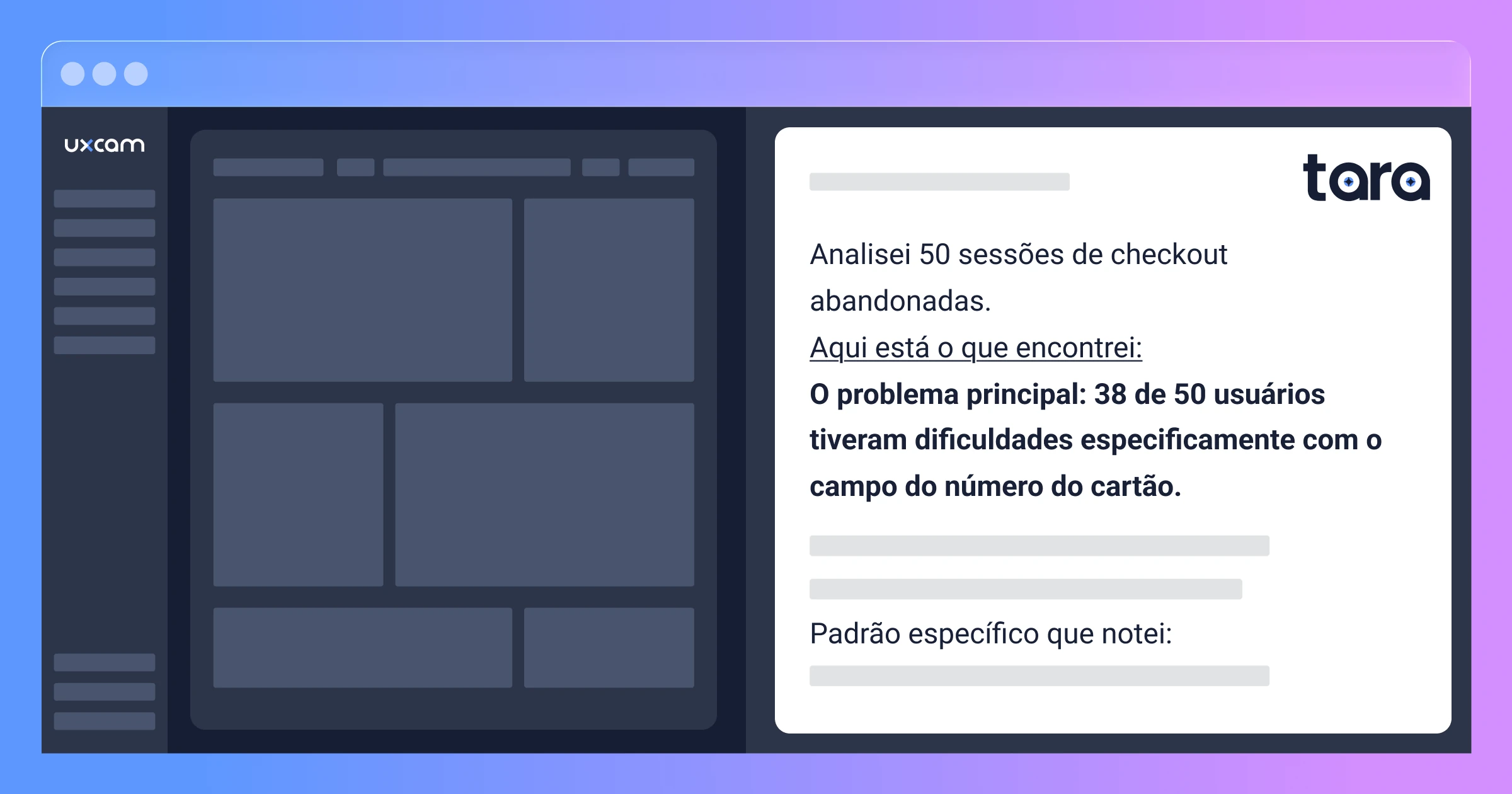 A Tara buscou automaticamente as gravações de sessão de checkout abandonadas relevantes, as assistiu e identificou o padrão no campo do cartão — o que teria levado dias de revisão manual para a equipe.