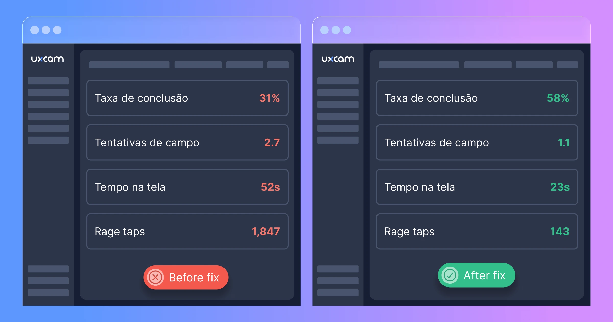 Abandono mensal no pagamento: 68.452 usuários Sessões com problemas no campo do cartão: ~42% (com base na análise de gravação de sessão da UXCam) Usuários afetados pelo erro: ~28.750/mês Valor médio do carrinho: $73 Conversão esperada se o formulário funcionasse: ~70% (com base em referências do setor para usuários que chegam aos detalhes de pagamento) Perda de receita mensal: 28.750 × $73 × 0,70 = $1.469.125