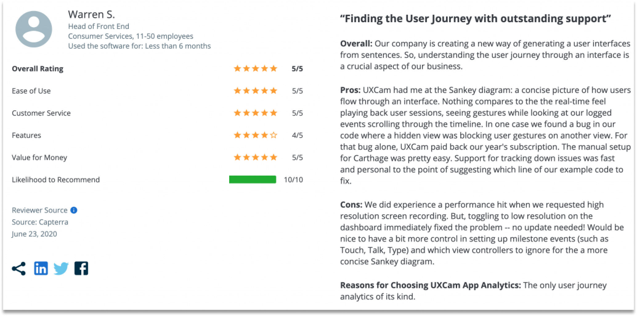 Não é bem um recurso, mas a UXCam recentemente se classificou como líder #1 em Usabilidade e Implementação para ferramentas de aplicativos móveis no site de avaliação G2.