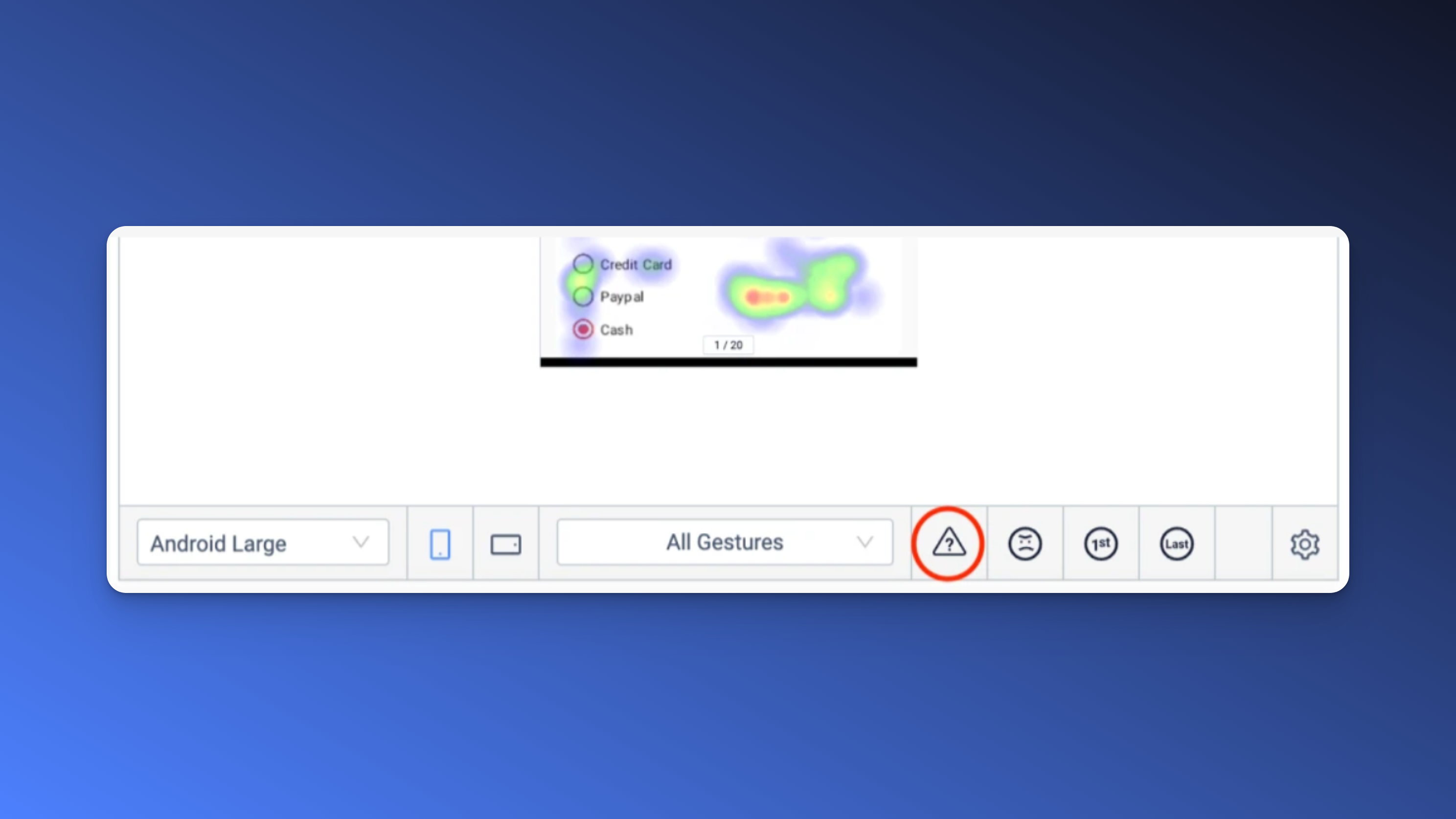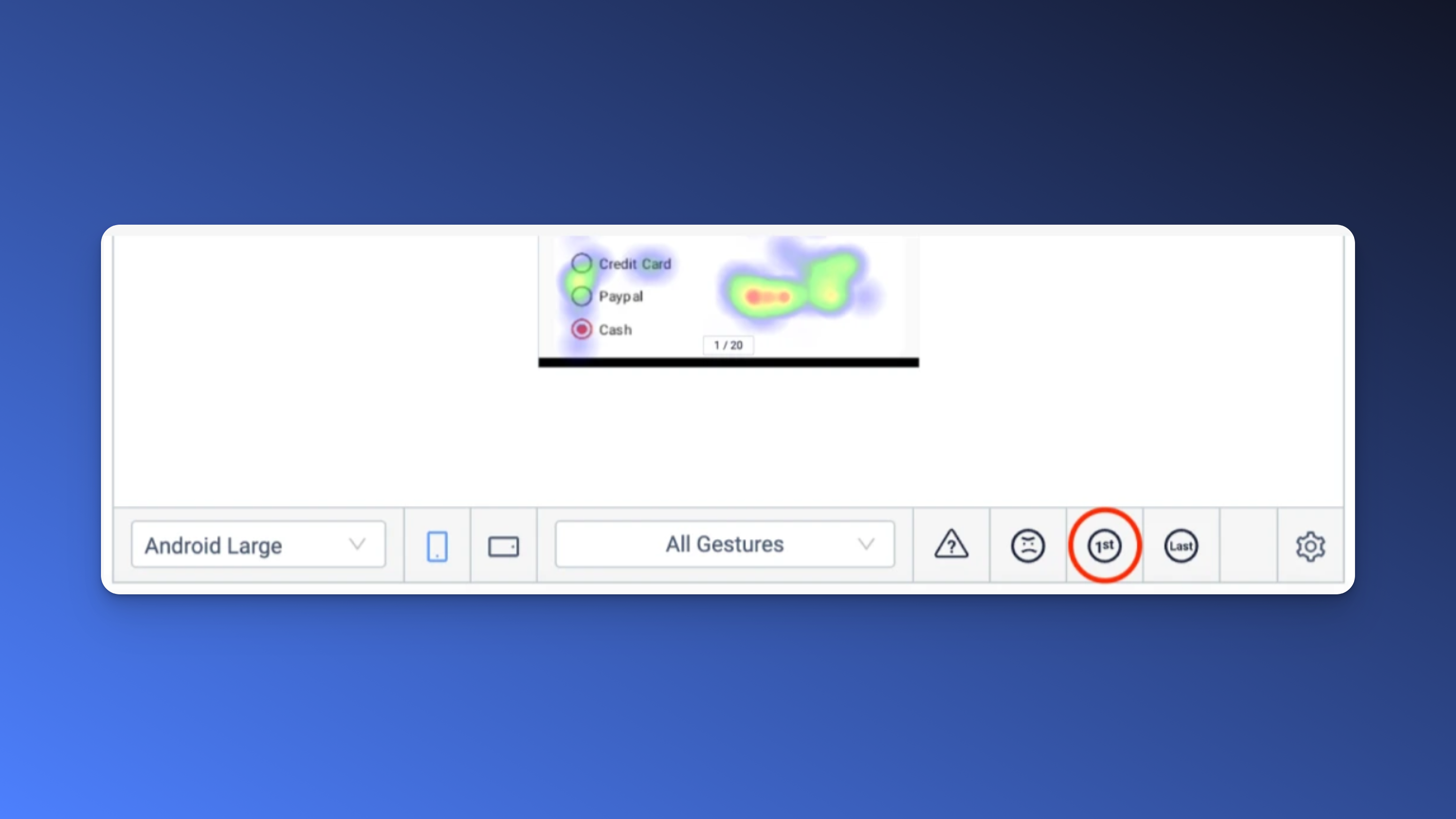 Os seres humanos são rápidos em formar uma primeira impressão. Com os heatmaps para primeiros gestos, você pode ver onde os usuários tocam intuitivamente quando veem uma tela pela primeira vez.